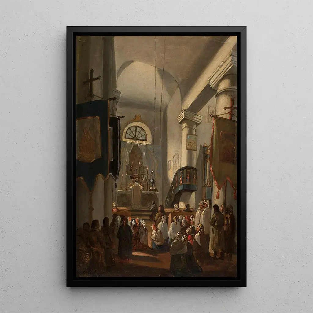 In deze kunstdruk van Binnenkant van een kerk met figuren dompelt Ignacy Gierdziejewski ons onder in een spirituele sfeer. De warme kleuren en het spel van licht creëren een bijna mystieke ambiance, waarin elk personage verdiept lijkt in zijn gebed. De compositie, rijk aan details, leidt het oog naar de architectonische elementen van de kerk, terwijl de uitdrukkingen van de menselijke figuren worden benadrukt. Dit schilderij roept een gemeenschap op tussen het heilige en het profane, en nodigt de kijker uit om de diepte van het geloof en het innerlijke leven te voelen.