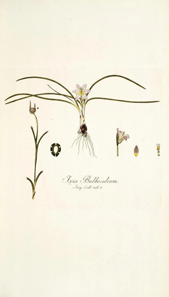 Nikolaus Joseph Freiherr von Jacquin, botanist en kunstenaar uit de achttiende eeuw, heeft zijn tijd gekenmerkt door zijn bijdragen aan de botanica en de kunst. Zijn reizen over de hele wereld stelden hem in staat om zeldzame plantensoorten te ontdekken en te illustreren, waardoor hij een pionier werd op het gebied van botanische illustratie. Zijn stijl, die wetenschappelijke precisie combineert met artistieke gevoeligheid, is representatief voor de Verlichting. "Ixia bulbocodium" getuigt van zijn inzet om de schoonheid van de natuur te eren en tegelijkertijd de botanische kennis van zijn tijd te verrijken.