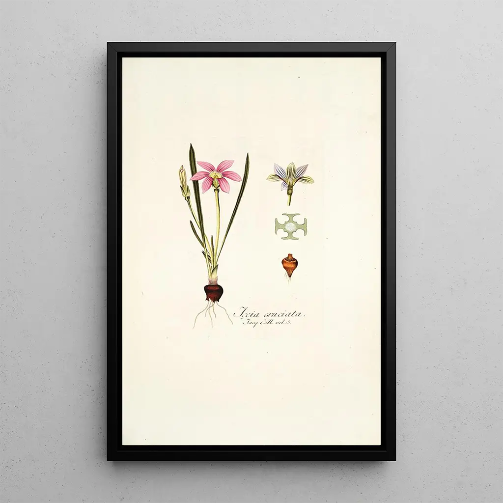 L'œuvre "Ixia cruciata" de Nikolaus Joseph Freiherr von Jacquin se présente comme une véritable ode à la nature. Deze doek, rijk aan levendige nuances, vangt de essentie van de bloem met opmerkelijke precisie. De heldere kleuren, variërend van geel tot rood, mengen harmonieus, waardoor een sfeer ontstaat die zowel vrolijk als rustgevend is. De techniek van de kunstenaar, die botanisch realisme combineert met een vleugje romantiek, stelt je in staat om elk detail van deze fascinerende plant te waarderen. Bij het bekijken van deze kunstdruk word je meegenomen naar een weelderige tuin, waar de schoonheid van de bloemen bloeit onder een stralende hemel.
