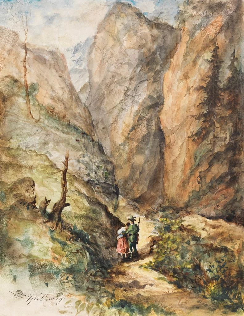 Carl Spitzweg, iconisch figuur van de Duitse romantiek, wordt vaak erkend voor zijn vermogen om de nuances van het menselijk leven vast te leggen in zijn werken. Zijn carrière, gekenmerkt door een productieve artistieke productie, getuigt van een diepe betrokkenheid bij de thema's natuur, liefde en eenzaamheid. Geïnspireerd door de literaire stromingen van zijn tijd, slaagt Spitzweg erin een narratieve dimensie aan zijn schilderijen toe te voegen, waardoor elk werk niet alleen een object van bewondering is, maar ook een verhaal op zich. Zijn invloed blijft voortbestaan en inspireert vele hedendaagse kunstenaars die streven naar het combineren van esthetiek en emotie in hun creaties. "Jagers en meisjes" past perfect in deze lijn en echoot de universele menselijke zorgen die door de eeuwen heen blijven bestaan.