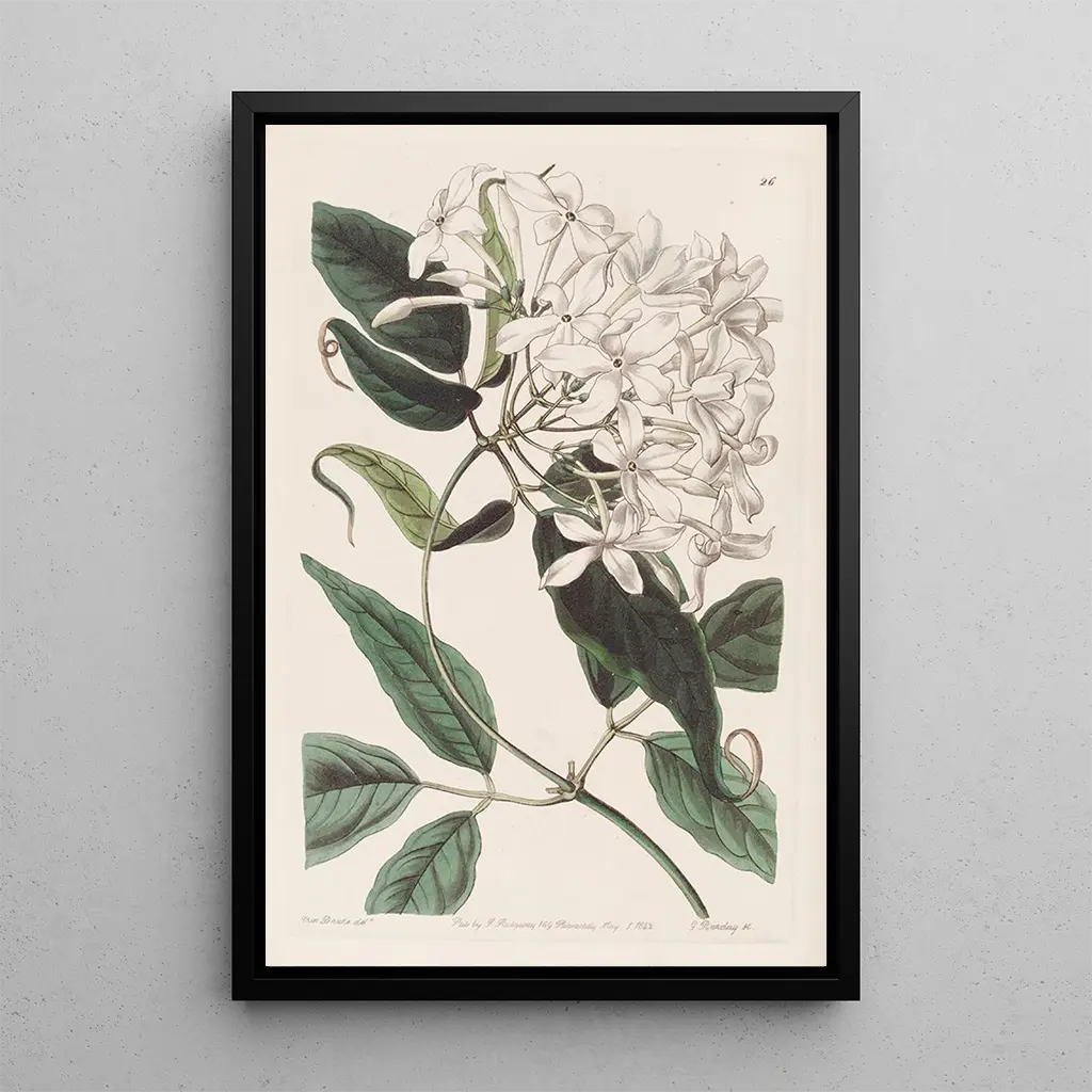 Le tableau Jasmin à feuilles de tilleul, signé par Sydenham Edwards, évoque une douceur florale empreinte de sérénité. Les teintes douces de blanc et de vert s'entrelacent, créant une ambiance légère et aérienne. La représentation précise des feuilles et des fleurs, avec une attention minutieuse aux détails, témoigne de l'expertise d'Edwards en matière d'illustration botanique. Chaque élément de cette œuvre semble respirer la fraîcheur du jardin, invitant le spectateur à plonger dans un monde de beauté naturelle. Cette toile est une véritable célébration de la flore, capturant l'essence même du jasmin.