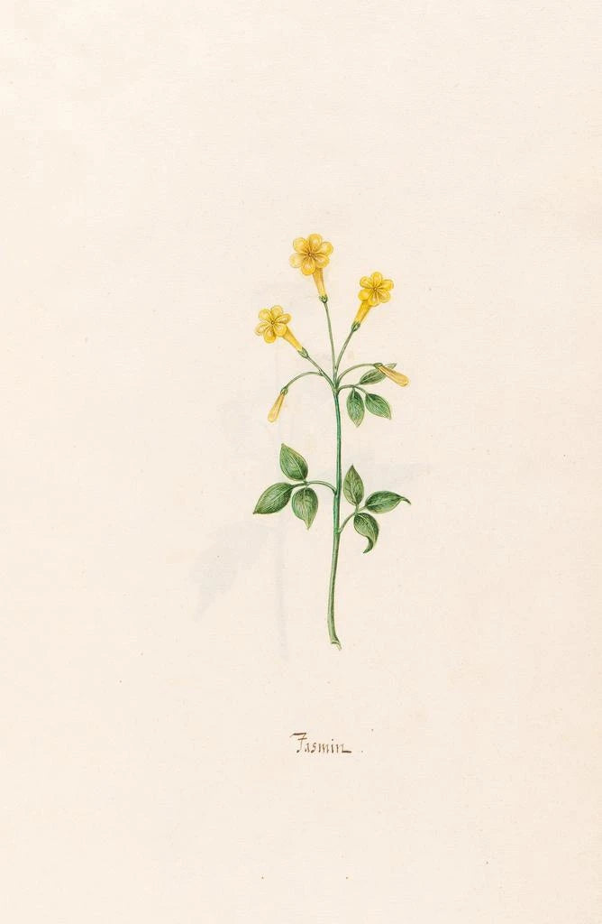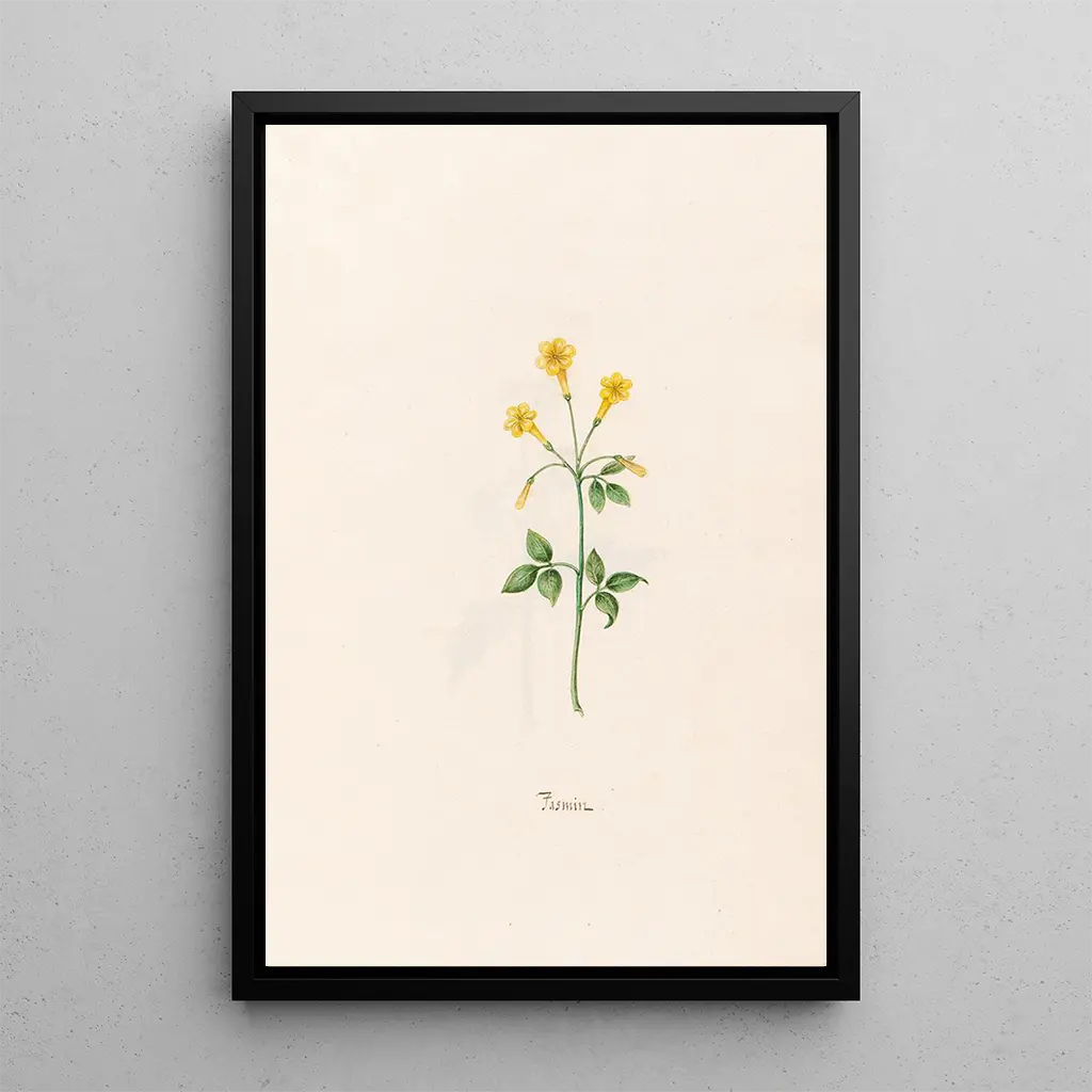 De kunstdruk Jasmin van Magdalena Rosina Funck dompelt ons onder in een bloemrijk universum vol zachtheid. De pastelkleuren, gedomineerd door tinten wit en groen, creëren een rustgevende, bijna dromerige sfeer. De aquareltechniek, met haar lichte en vloeiende penseelstreken, brengt elk bloemblaadje, elk blad tot leven, alsof de jasmijn op het punt staat te bloeien voor onze ogen. Het werk nodigt uit tot een rustige contemplatie, waarin de vergankelijke schoonheid van de natuur wordt benadrukt, en de magie van vaak over het hoofd geziene details wordt onthuld.