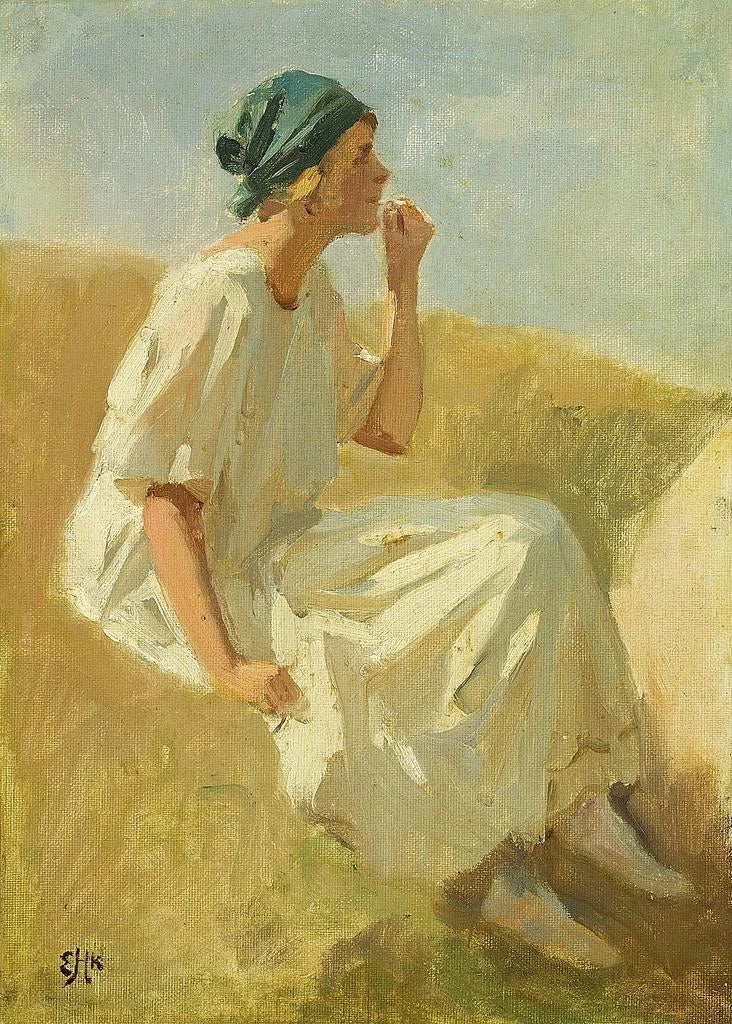Schilderij Jonge vrouw zittend met een groene sjaal - Erik Henningsen | Kunstdruk