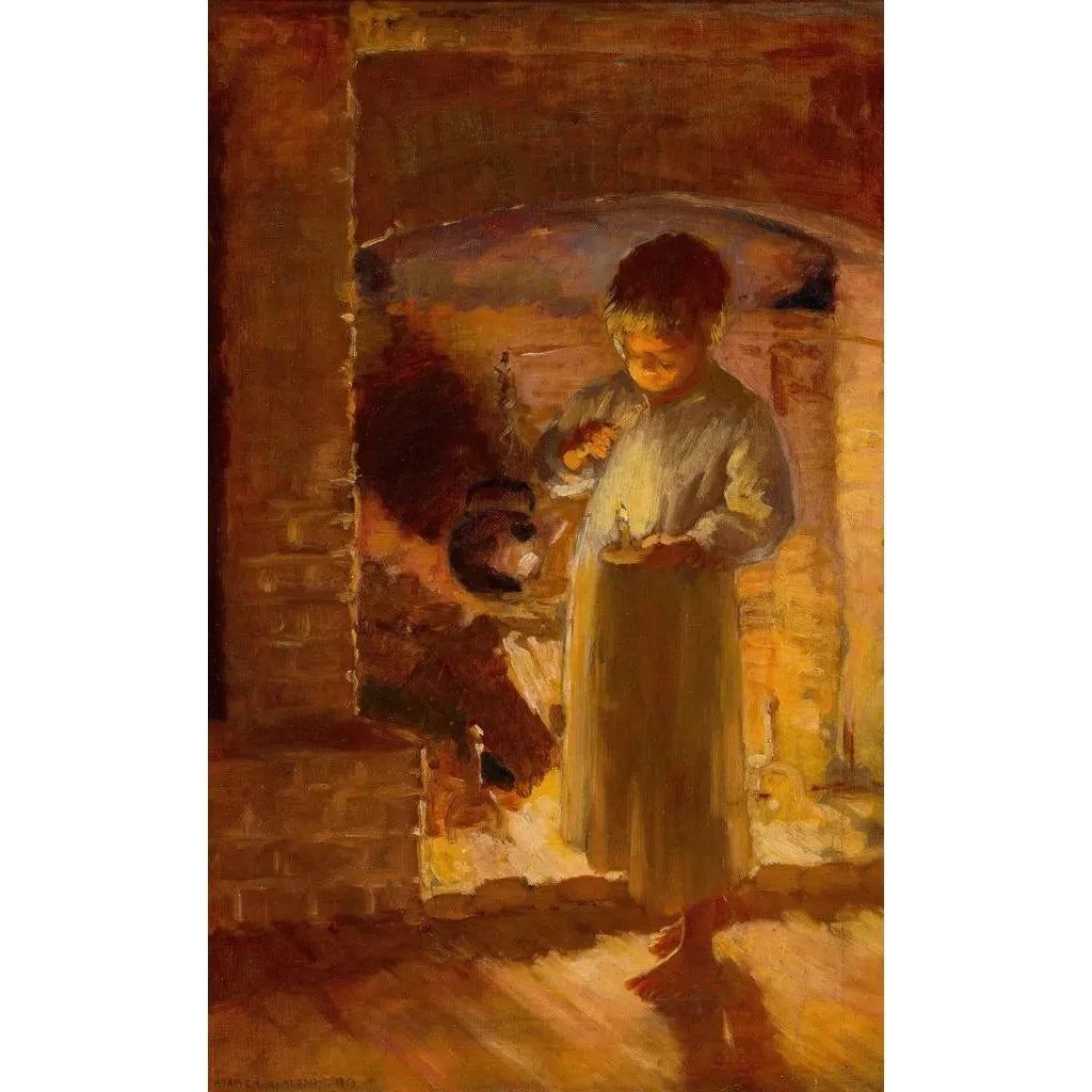 Adam Emory Albright, actief in het begin van de 20e eeuw, wordt erkend om zijn talent om scènes uit het dagelijks leven met grote gevoeligheid weer te geven. Geïnspireerd door de realistische beweging, specialiseerde hij zich in het schilderen van portretten en genrestukken, waarbij hij de schoonheid van eenvoudige momenten benadrukt. Zijn carrière werd gekenmerkt door een bijzondere aandacht voor details en een vermogen om de menselijke essentie vast te leggen. Albright was ook een invloedrijk lid van de Amerikaanse kunstscene, dat bijdroeg aan de evolutie van het realisme en de waardering voor huiselijke scènes. Zijn werk, waarvan deze kunstdruk van brandende kaars bij de haard een perfect voorbeeld is, getuigt van zijn inzet om het leven zoals het is te vereeuwigen.