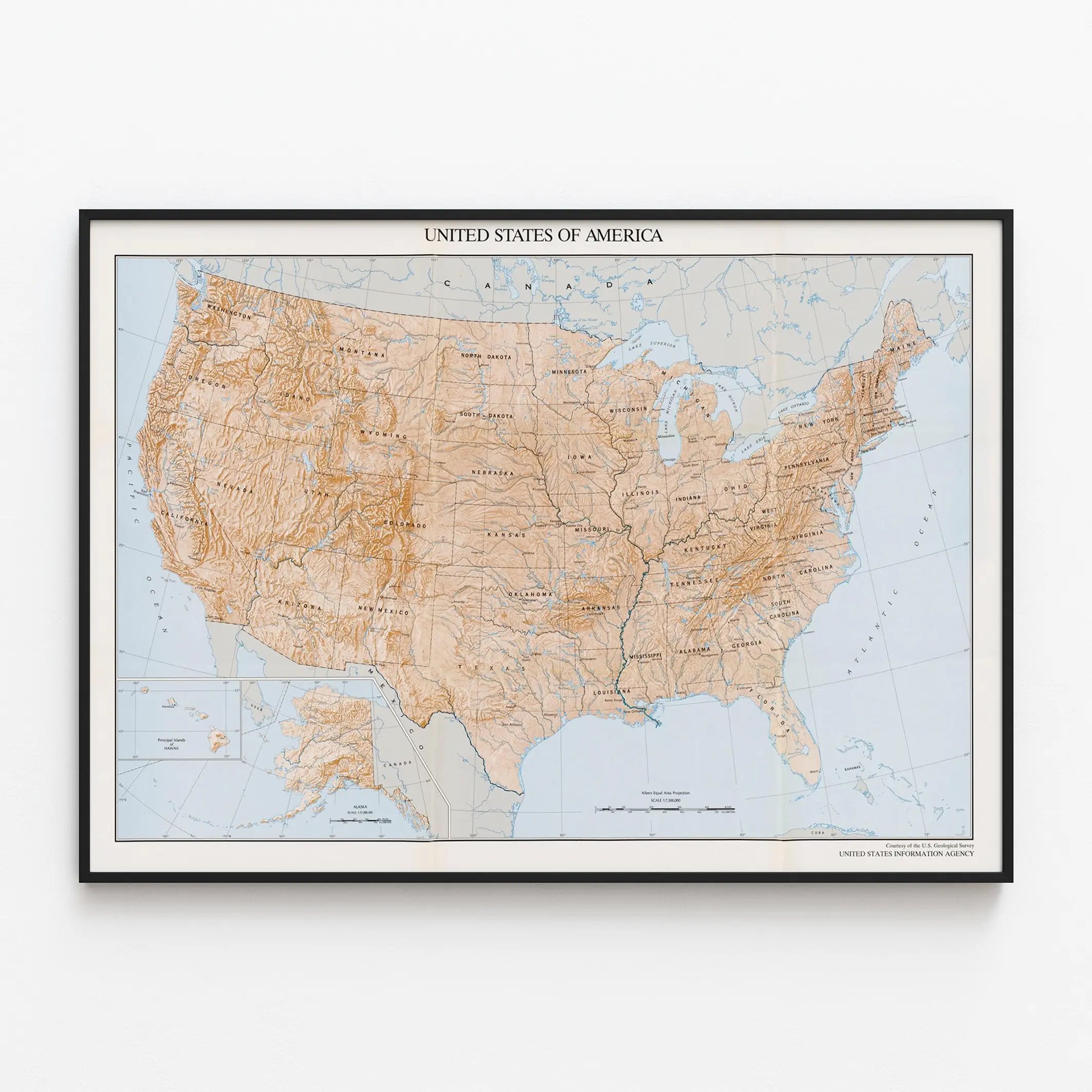Deze muurdecoratie is een uitstekend aanvulling voor wie de geografie van de Verenigde Staten visueel wil verkennen en tegelijkertijd hun interieur wil verfraaien met een educatieve en elegante affiche. Of het nu voor persoonlijk gebruik is of als cadeau-idee voor een cartografie-liefhebber, deze fijne en volledige topografische weergave van de Verenigde Staten brengt een warme en leerzame sfeer in uw leefruimte.