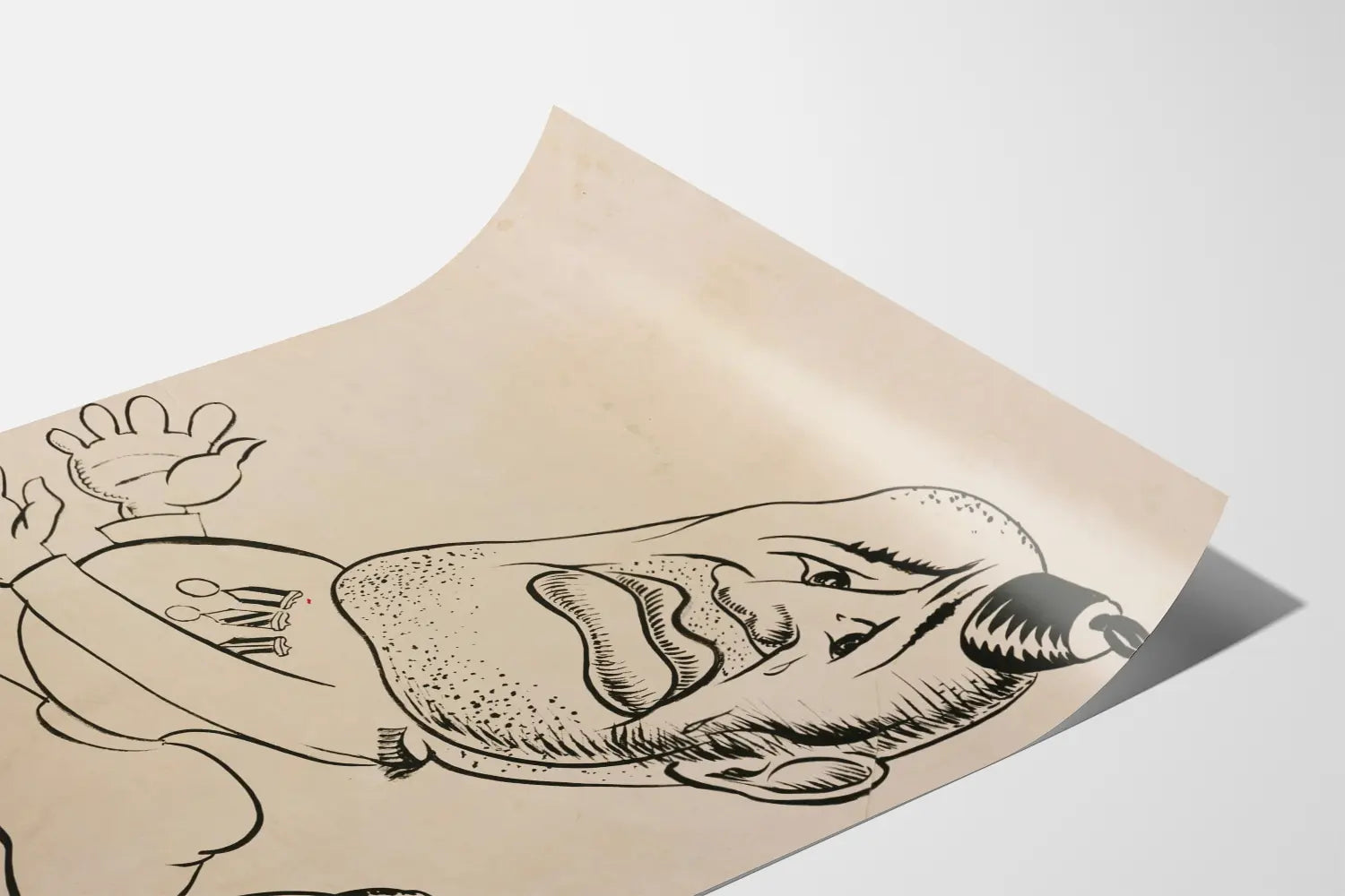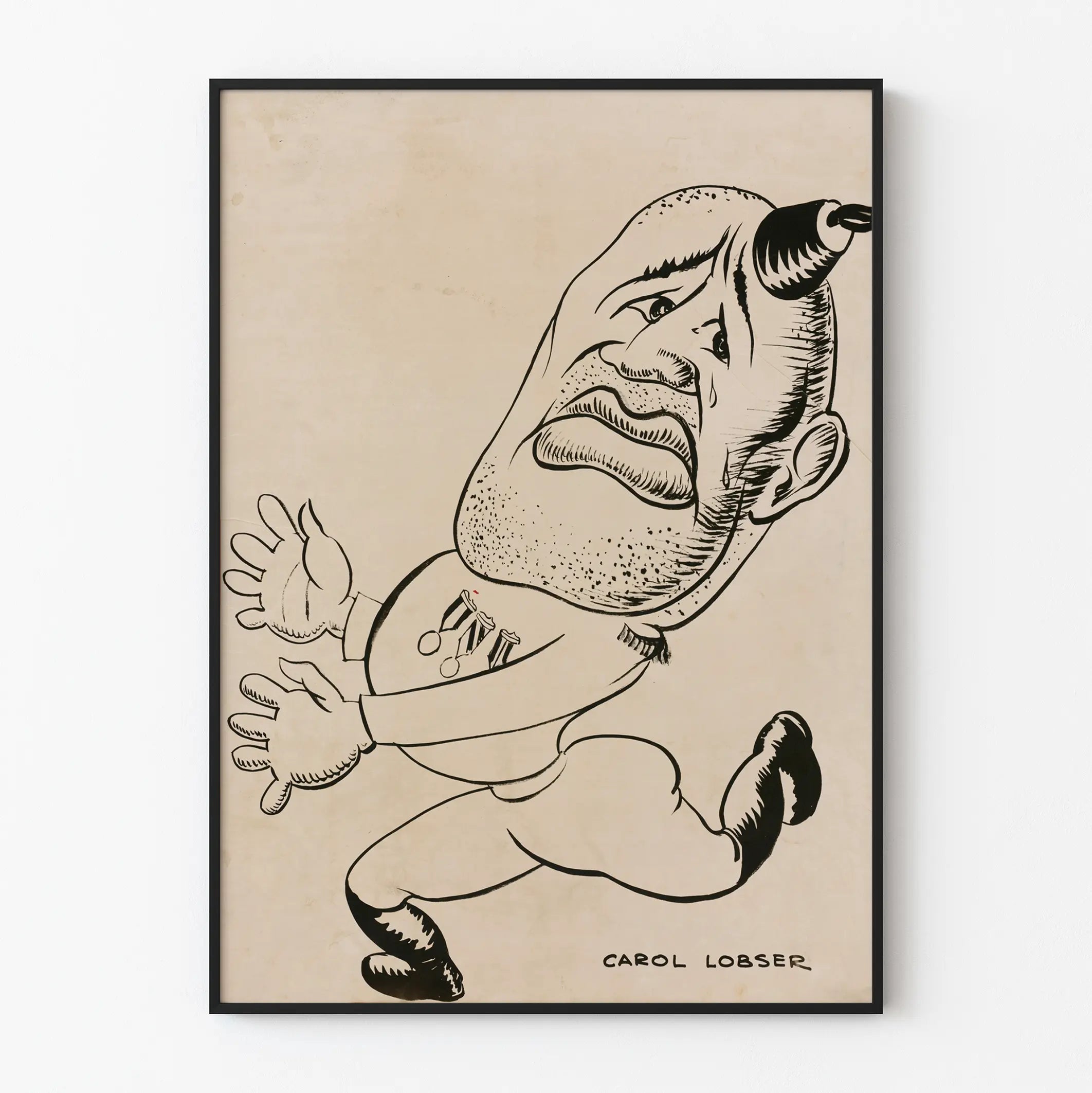 Deze karikaturale zwart-wit poster toont een in beweging zijnde soldaat, getekend met een expressieve en overdreven stijl. Het personage lijkt te rennen, voorovergebogen, met een gezicht dat wordt gekenmerkt door een droevige of bezorgde uitdrukking, versterkt door een zichtbare traan onder zijn oog. Zijn gezicht is ruw getekend met duidelijke lijnen, een baardje van enkele dagen en een opvallende neus. Een bijzonder element trekt de aandacht: een trompet of hoorn die op zijn hoofd ligt. De soldaat draagt een eenvoudige outfit versierd met drie medailles op de borst, waarschijnlijk symbool voor een militaire onderscheiding. De handen worden afgebeeld in een open houding, alsof hij probeert te stoppen of iets te grijpen. De bewegende benen geven een gevoel van dynamiek en urgentie. De tekening is ondertekend door Carol Lobser in de rechterbenedenhoek, wat wijst op een zorgvuldig artistiek werk en een sterke visuele identiteit. De achtergrond heeft een lichte beige tint die doet denken aan oud papier, wat het vintage en authentieke karakter van dit wanddecor versterkt. Deze karikaturale poster is ideaal voor liefhebbers van unieke illustraties die een vleugje originaliteit en reflectie willen toevoegen aan hun interieur. Hij past perfect in een modern kader of in een decor dat moderniteit en vintage combineert. Deze decoratieve affiche kan worden gebruikt om een muur in een woonruimte, kantoor of wachtkamer te verfraaien, en nodigt uit tot zowel emotie als contemplatie van een artistieke weergave van de militaire wereld met een kritische blik. Dit wandpaneel is een gedurfde keuze die de persoonlijkheid en de voorliefde voor geëngageerde kunst in uw interieurdecoratie zal benadrukken.