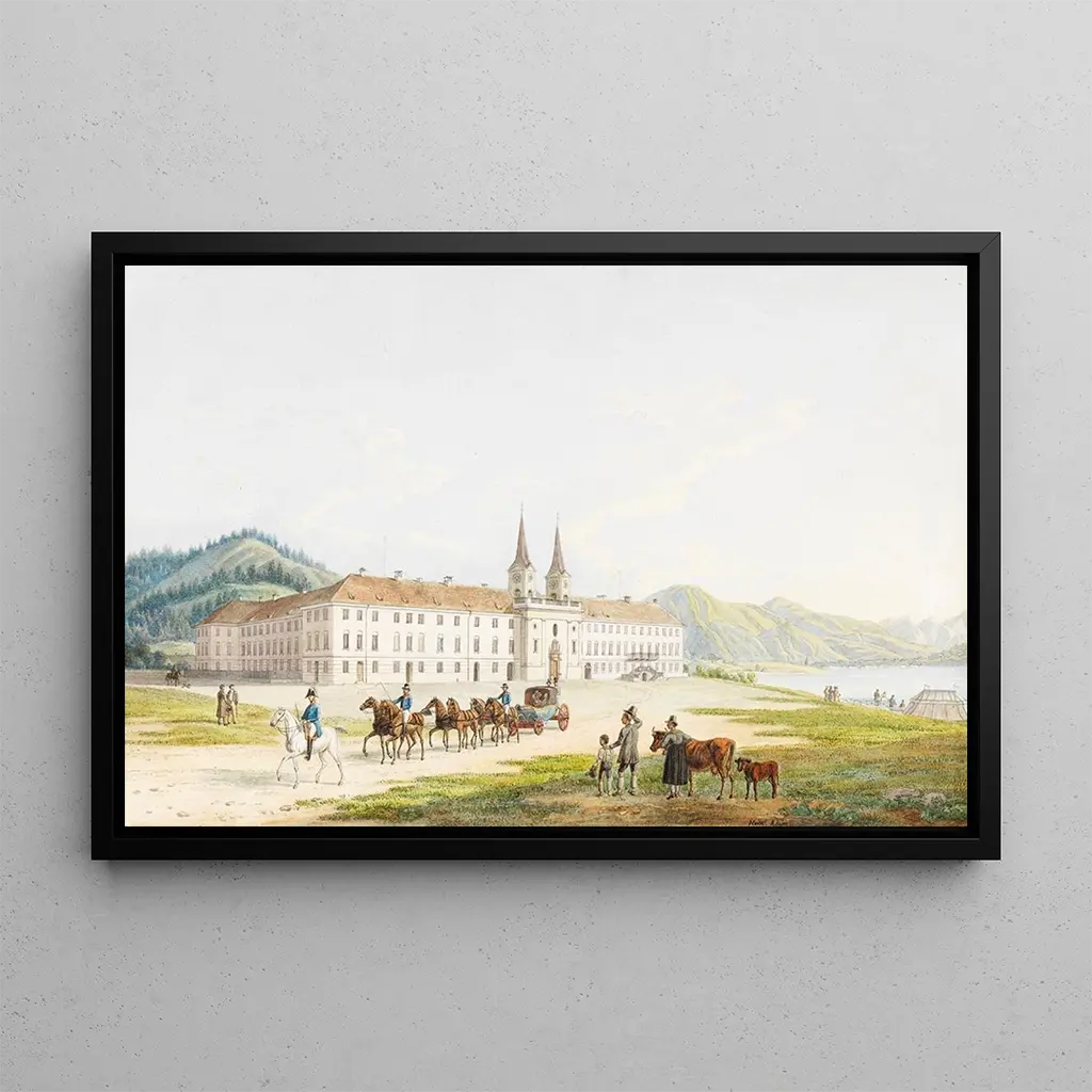 Château de Tegernsee : een symfonie van natuur en architectuur De afbeelding "Château de Tegernsee" brengt de kijker naar een betoverend landschap waar de majesteit van de architectuur samengaat met de natuurlijke schoonheid eromheen. De zachte tinten groen en blauw roepen een rustige sfeer op, terwijl de minutieuze details van het kasteel, met zijn schuine daken en versierde ramen, de blik vasthouden. De techniek van de kunstenaar, die behendig aquarel en olieverf combineert, creëert een verbluffende diepte en brengt deze iconische plek tot leven. Elke penseelstreek lijkt een verhaal te vertellen, uitnodigend tot contemplatie en ontsnapping in dit idyllische decor. Heinrich Adam : de getuige van een romantisch tijdperk Heinrich Adam, actief in de 19e eeuw, staat bekend om zijn romantische landschappen die de schoonheid van natuurlijke en architectonische sites vieren. Geïnspireerd door de romantische beweging, wist hij de essentie van de plaatsen die hij schilderde vast te leggen, met de nadruk op de harmonie tussen mens en natuur. Zijn werken, vaak geïnspireerd door reizen door Europa, tonen een bijzondere gevoeligheid voor licht en sfeer. Adam heeft een blijvende erfenis achtergelaten en beïnvloedt vele hedendaagse kunstenaars die de pracht van Europese landschappen willen vastleggen. Een decoratief stuk met vele voordelen De kunstdruk van het "Château de Tegernsee" is een decoratief stuk dat elke interieur kan verrijken, of het nu in een woonkamer, kantoor of slaapkamer is. De kwaliteit van de afdruk garandeert een opmerkelijke fideliteit aan de kleuren en details van het originele werk, wat zorgt voor een onmiskenbare esthetische aantrekkingskracht. Door dit schilderij in uw inrichting te integreren, brengt u een vleugje elegantie en sereniteit, terwijl u verwijst naar de geschiedenis en cultuur van een vervlogen tijd. Dit schilderij is veel meer dan een eenvoudige decoratie, het is een uitnodiging om te dromen en te ontsnappen in het hart van de natuur.