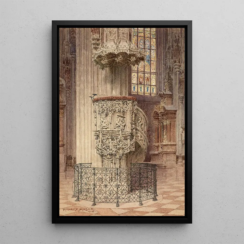 Cathédrale Saint-Étienne Chaire de Pilgram : un chef-d'œuvre de l'architecture gothique La Chaire de Pilgram, située dans la majestueuse Cathédrale Saint-Étienne de Vienne, est une œuvre d'art fascinante qui attire le regard par sa complexité et sa beauté. La richesse des détails sculptés, mêlée à des couleurs vibrantes, crée une atmosphère à la fois spirituelle et majestueuse. Chaque élément de cette chaire raconte une histoire, des motifs floraux aux figures bibliques, invitant à une exploration minutieuse. La lumière qui filtre à travers les vitraux accentue les nuances et les textures, transformant cet espace sacré en une véritable œuvre d'art vivante. Richard Moser : un artiste au cœur de l'héritage viennois Richard Moser, bien que moins connu que d'autres artistes de son époque, a joué un rôle essentiel dans la préservation de l'héritage artistique de Vienne. Son travail, influencé par le néo-gothique et le baroque, reflète une période de renouveau culturel au début du XXe siècle. Moser a su capturer l'essence des monuments historiques, rendant hommage à la richesse architecturale de sa ville natale. Ses œuvres, dont la Chaire de Pilgram, sont des témoignages précieux de l'art et de l'architecture viennois, offrant une perspective unique sur l'évolution de ces styles au fil du temps. Une acquisition décorative aux multiples atouts La reproduction de la Chaire de Pilgram est un ajout précieux à toute collection d'art, idéale pour embellir un salon, un bureau ou une chambre. Sa qualité d'impression exceptionnelle et son attention aux détails garantissent une fidélité remarquable à l'œuvre originale. Ce tableau, avec son caractère historique et artistique, apporte une touche de sophistication à votre intérieur. En choisissant cette toile, vous offrez à votre espace une dimension culturelle et esthétique, tout en célébrant l'héritage artistique de Vienne.