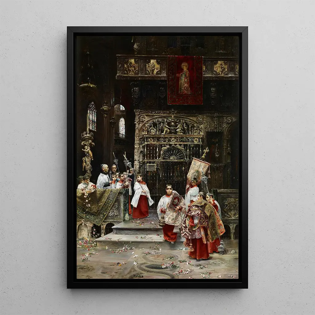 « Enfants de chœur » de José Gallegos y Arnosa est une œuvre qui dépeint la pureté et l'innocence de la jeunesse à travers le regard de jeunes garçons en habits liturgiques. Les couleurs douces et lumineuses, associées à une composition équilibrée, transmettent une atmosphère de sérénité et de dévotion. Gallegos y Arnosa utilise des techniques de peinture qui mettent en avant les expressions délicates des enfants, créant ainsi un tableau empreint de tendresse et de spiritualité. Chaque détail, des visages aux drapés, est soigneusement travaillé pour évoquer une sensation de paix et de recueillement.
