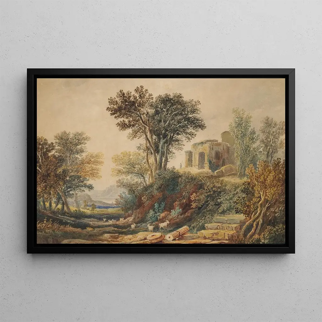 Klassiek landschap met ruïnes: een harmonie tussen natuur en geschiedenis Dit schilderij, getiteld "Klassiek landschap met ruïnes", roept een scène op die doordrenkt is van sereniteit en nostalgie. De zachte kleuren en aardse tinten creëren een rustige sfeer, terwijl de majestueuze ruïnes een glorieuze verleden suggereren. De compositie, zorgvuldig in balans, leidt de blik door het landschap en nodigt de kijker uit om elk detail te verkennen. De techniek van Samuel Rostill Lines, gekenmerkt door minutieuze realisme, laat je de textuur van natuurlijke en architecturale elementen voelen. Dit schilderij is een ware uitnodiging tot contemplatie, waarbij elke blik een nieuw facet van deze harmonie tussen mens en natuur onthult. Samuel Rostill Lines: een meester van het romantische landschap Samuel Rostill Lines is een Britse kunstenaar uit de 19e eeuw, erkend om zijn evocatieve landschappen die natuur en architectuur combineren. Geïnspireerd door de romantische beweging, probeert hij de sublieme schoonheid van landschappen vast te leggen terwijl hij historische elementen integreert. Zijn werk onderscheidt zich door een bijzondere aandacht voor details en een kleurenpalet dat diepe emoties oproept. Lines heeft zich weten te vestigen in de kunstwereld dankzij zijn vermogen om de kijker mee te nemen naar plaatsen vol mysterie en melancholie. Zijn schilderijen, waaronder "Klassiek landschap met ruïnes", getuigen van het belang van de natuur in de kunst van zijn tijd en van zijn blijvende erfenis. Een decoratieve aankoop met vele voordelen De kunstdruk van "Klassiek landschap met ruïnes" is een ideale keuze om je interieurdecoratie te verrijken. Of het nu in een woonkamer, kantoor of slaapkamer is, dit schilderij brengt een vleugje elegantie en verfijning. De afdrukkwaliteit garandeert een opmerkelijke fideliteit aan de details van het originele werk, zodat je kunt genieten van de volledige visuele rijkdom van Lines' kunst. De esthetische aantrekkingskracht van dit doek maakt het een centraal element in je inrichting, dat bewondering en gesprekken uitlokt. Door deze kunstdruk in je ruimte te integreren, nodig je geschiedenis en schoonheid uit in je dagelijks leven.