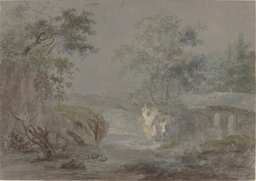 Bosrijke kliffen langs een oever - Johann Caspar Huber