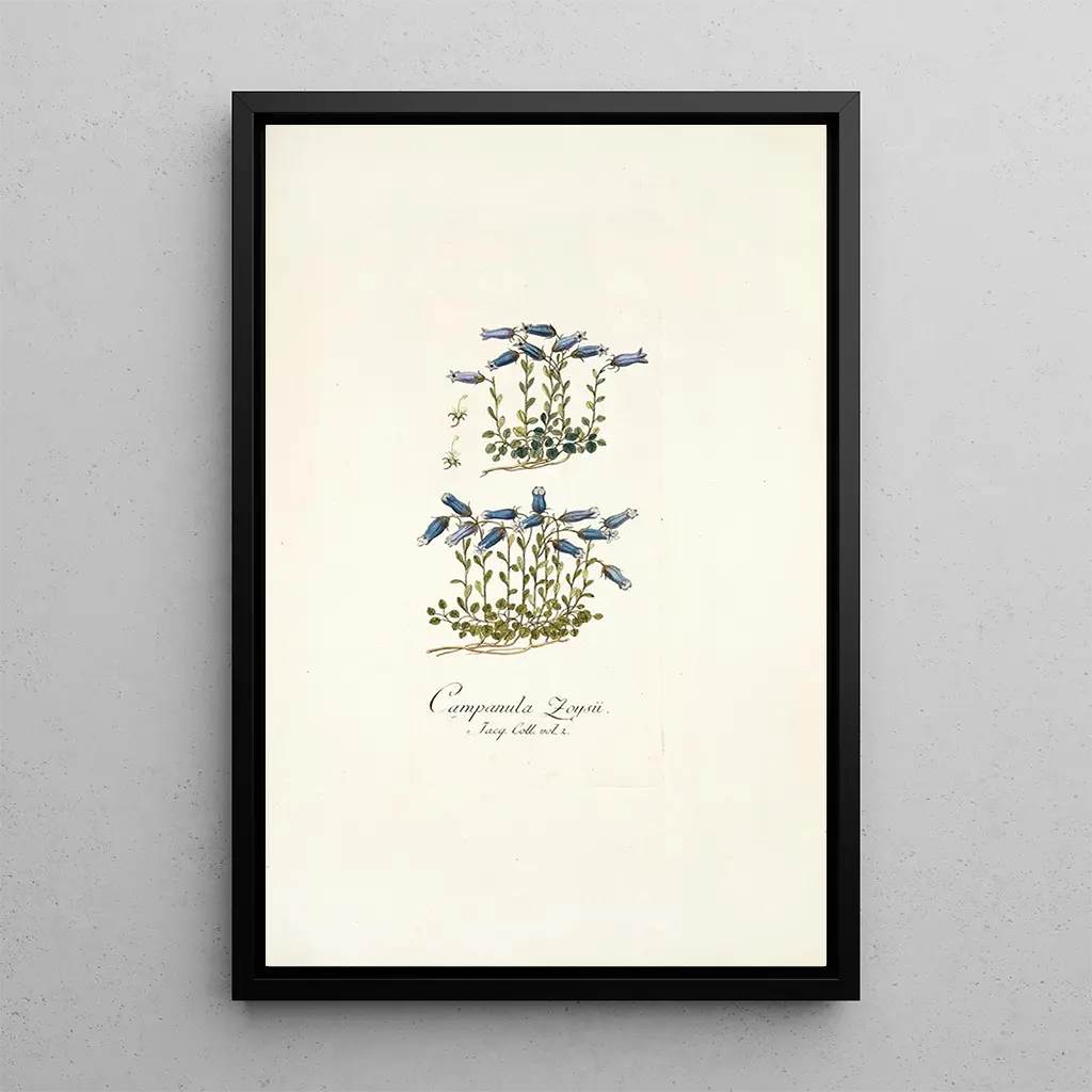De kunstdruk van Campanula zoysii dompelt ons onder in een bloemrijk universum waar de fijnheid van de bloemblaadjes samengaat met de rijkdom van nuances. De zachte tinten violet en blauw mengen subtiel, waardoor een rustgevende en contemplatieve sfeer ontstaat. De aquareltechniek, vakkundig toegepast door de kunstenaar, maakt het mogelijk de lichtheid en transparantie van de bloemen vast te leggen, terwijl het een bijna voelbare textuur biedt. Elk detail, van de nerven van de bladeren tot de contouren van de bloemen, wordt zorgvuldig weergegeven, waardoor de kijker wordt uitgenodigd stil te staan bij de vergankelijke schoonheid van de natuur.