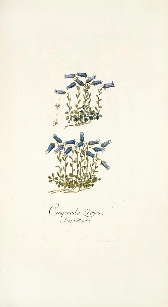 Nikolaus Joseph Freiherr von Jacquin, botanist en kunstenaar uit de achttiende eeuw, speelde een essentiële rol in de wetenschappelijke illustratie van planten. Opgeleid aan de Universiteit van Wenen, werd hij beïnvloed door de ontdekkingen van zijn tijd en reisde hij door Europa en de Antillen om specimens te verzamelen. Zijn werk, vooral op het gebied van botanica, heeft bijgedragen aan het begrip van plantensoorten en hun classificatie. Campanula zoysii is een van zijn vele werken die wetenschap en kunst combineren, en getuigt van het belang van een getrouwe weergave van planten in de context van de opkomst van de natuurlijke wetenschappen.