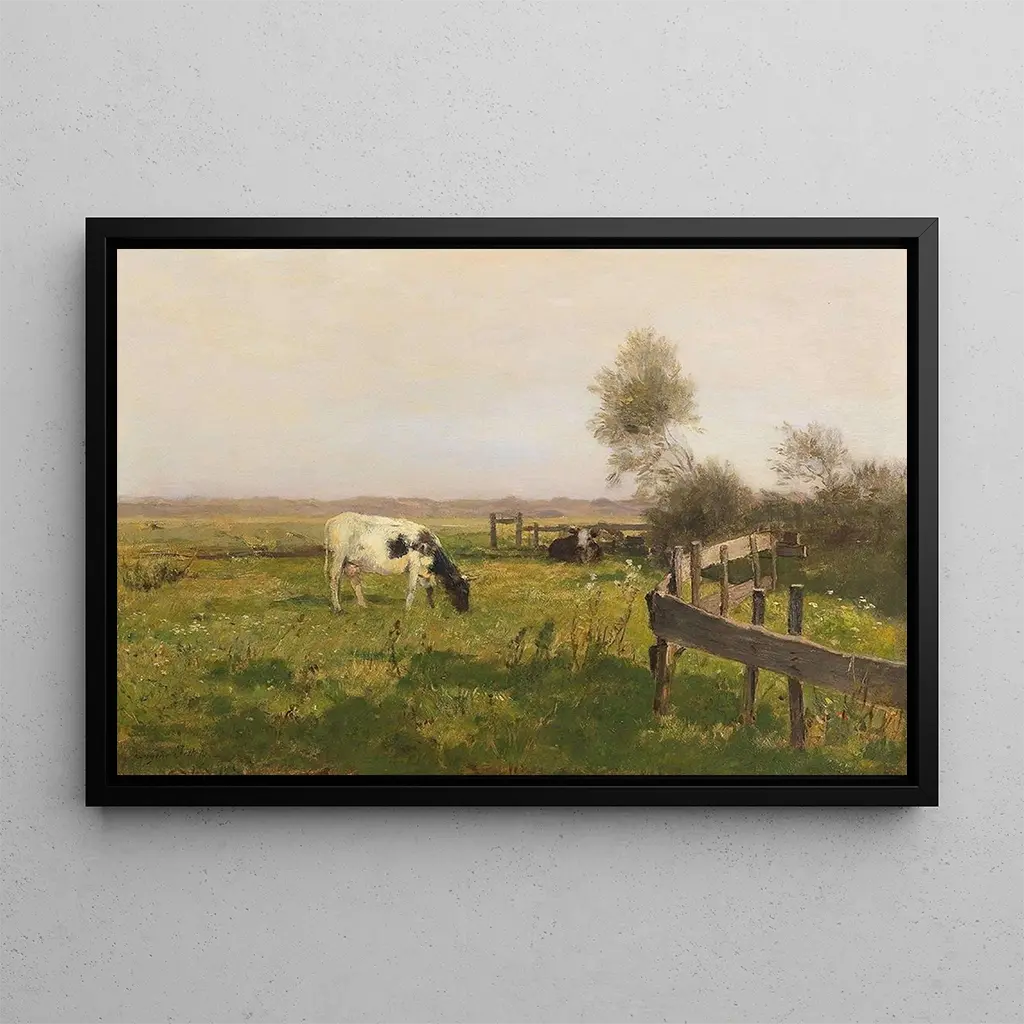 Vache au pâturage : een idyllisch tafereel doordrenkt met sereniteit De kunstdruk Vache au pâturage van Eugen Jettel brengt ons naar een landelijk landschap waar rust de boventoon voert. Dit werk, gemaakt met zachte en natuurlijke kleuren, roept de eenvoudige schoonheid van het plattelandsleven op. De tinten groen van de weilanden, gemengd met accenten van bruin en wit van de koe, creëren een rustgevende sfeer. De olieverftechniek, beheerst door Jettel, stelt hem in staat het licht op een manier vast te leggen die de scène tot leven brengt. Elke penseelstreek lijkt de rust van een zonnige namiddag uit te stralen, en nodigt de kijker uit om zich onder te dompelen in deze ongerepte natuur. Eugen Jettel : een meester van het landelijk landschap Eugen Jettel, een Oostenrijkse schilder uit de 19e eeuw, wordt erkend om zijn weergaven van de natuur en landelijke scènes. Geïnspireerd door de impressionistische beweging, wist hij elementen van licht en kleur te integreren die zijn werken levendig maken. Jettel bracht een groot deel van zijn carrière door met het verkennen van het landschap van het platteland, op zoek naar de essentie van het buitenleven. Zijn werk wordt vaak geassocieerd met een periode waarin de kunst zich richtte op de natuur, als reactie op de groeiende industrialisatie. De kunstdruk Vache au pâturage getuigt van zijn talent om momenten van eenvoud en schoonheid te vereeuwigen. Een decoratief stuk met vele voordelen De kunstdruk van het schilderij Vache au pâturage is een ideaal decoratief stuk om een vleugje natuur in uw interieur te brengen. Of het nu in een woonkamer, kantoor of slaapkamer is, dit doek past harmonieus in diverse stijlen van inrichting, van rustiek tot modern. De afdrukkwaliteit garandeert een opmerkelijke trouw aan de kleuren en details van het originele werk, terwijl het een onmiskenbare esthetische aantrekkingskracht biedt. Door te kiezen voor deze kunstdruk, kiest u voor een werk dat vrede en sereniteit uitstraalt, en uw leefruimte verrijkt met een artistiek en warm accent.