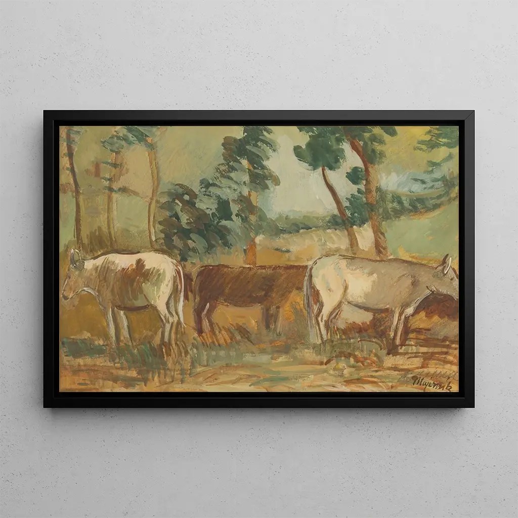 Kravy, een kunstdruk van Cyprian Majernik, dompelt ons onder in een levendige wereld waar kleuren zich op een verbluffende harmonie met elkaar verweven. De compositie, rijk aan details, roept een vloeiende, bijna muzikale beweging op die de blik trekt en uitnodigt om elk hoekje van het doek te verkennen. De warme en koude tinten wisselen elkaar af, waardoor een opvallend contrast ontstaat dat de scène tot leven brengt. De techniek van Majernik, die fijne penseelstreken combineert met gedurfde kleurvlakken, draagt bij aan een sfeer die zowel dynamisch als rustgevend is, waarin elk element lijkt een verhaal te vertellen.
