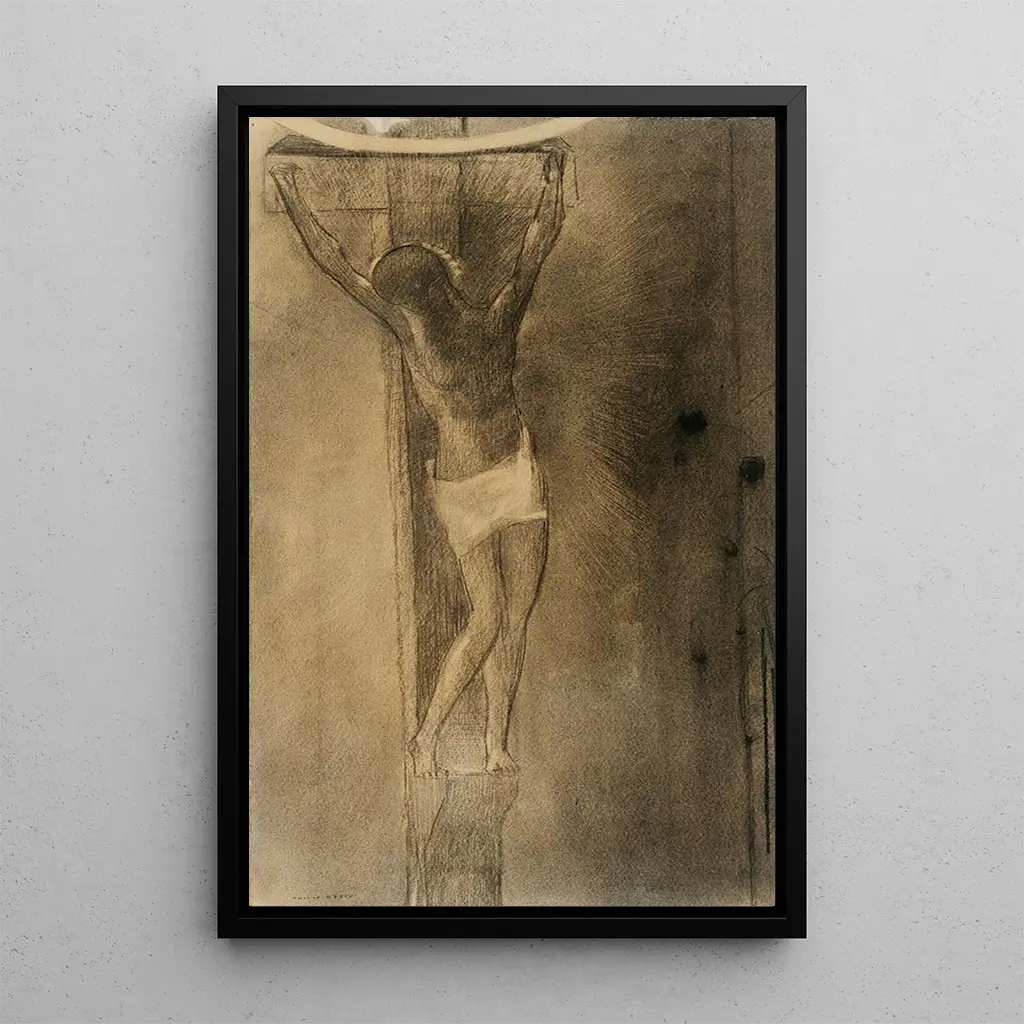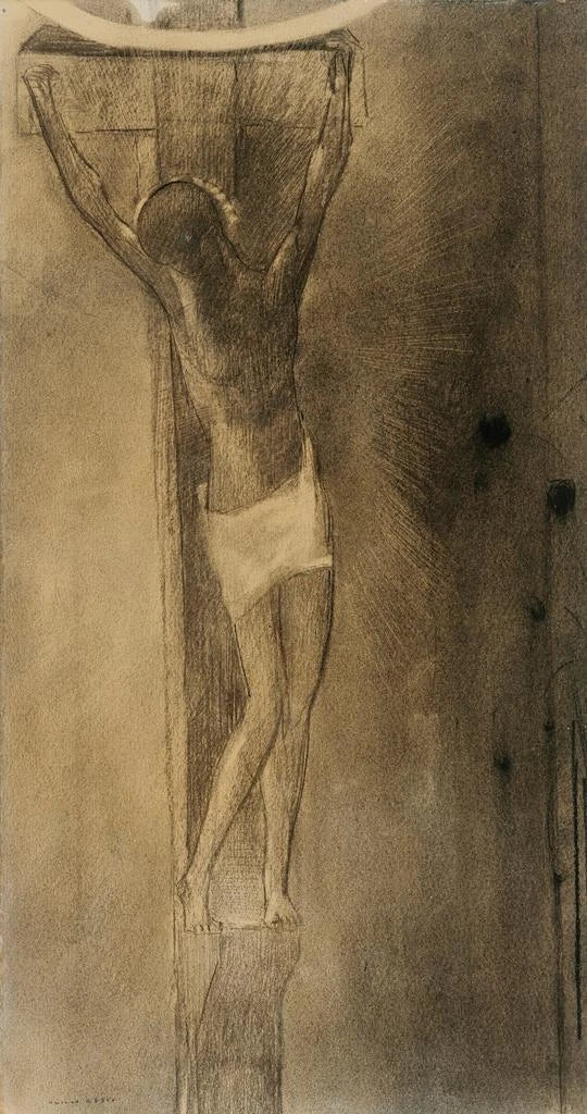 In "Crucifixie" verkent Odilon Redon de thema's van lijden en verlossing met een aangrijpende intensiteit. De compositie, zowel dramatisch als sereen, beeldt de figuur van Christus af in een halo van licht, contrasterend met de omringende duisternis. De donkere kleuren, gemengd met lichte accenten, creëren een sfeer die zowel tragisch als transcendent is. De techniek van Redon, die gebruikmaakt van delicate nuances en gestileerde vormen, nodigt uit tot een diepe reflectie over het offer en spiritualiteit. Dit kunstwerk, doordrenkt met mysterie, resoneert met de menselijke ziel en raakt universele emoties.