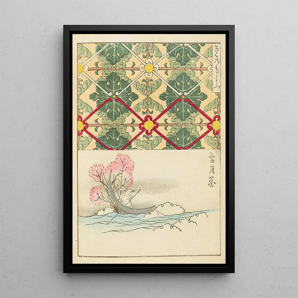De kunstdruk Bijutsukai Pl225 van Furuya Korin roept een betoverende sereniteit op, waarbij elk element lijkt te dansen in perfecte harmonie. De zachte kleuren, die tinten van blauw, groen en goud combineren, creëren een rustgevende, bijna meditatieve sfeer. De schildertechniek, kenmerkend voor de Rimpa-school, uit zich in vloeiende lijnen en gestileerde motieven die de vergankelijke schoonheid van de natuur herinneren. Dit kunstwerk nodigt uit tot contemplatie, waardoor de kijker zich kan onderdompelen in een wereld waar schoonheid en evenwicht heersen.