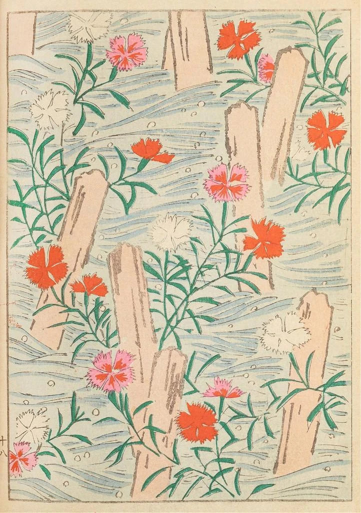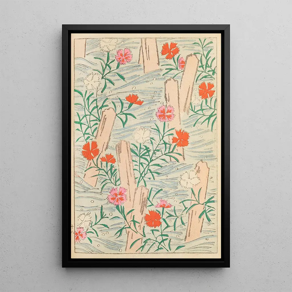 De kunstdruk van Bijutsukai Pl59 roept een delicate scène op waarin de natuur zich uit in al haar pracht. De bloemmotieven, zorgvuldig gerangschikt, vangen de essentie van de seizoenen met een palet van zachte en rustgevende kleuren. De techniek van de ukiyo-e maakt het mogelijk om elk detail met opmerkelijke precisie weer te geven, waardoor een sfeer van rust en sereniteit ontstaat. De nuances van groen en roze mengen harmonieus, en nodigen de kijker uit tot een vredige contemplatie. Dit schilderij is een ware uitnodiging om te ontsnappen naar een wereld waar de natuurlijke schoonheid heerst.