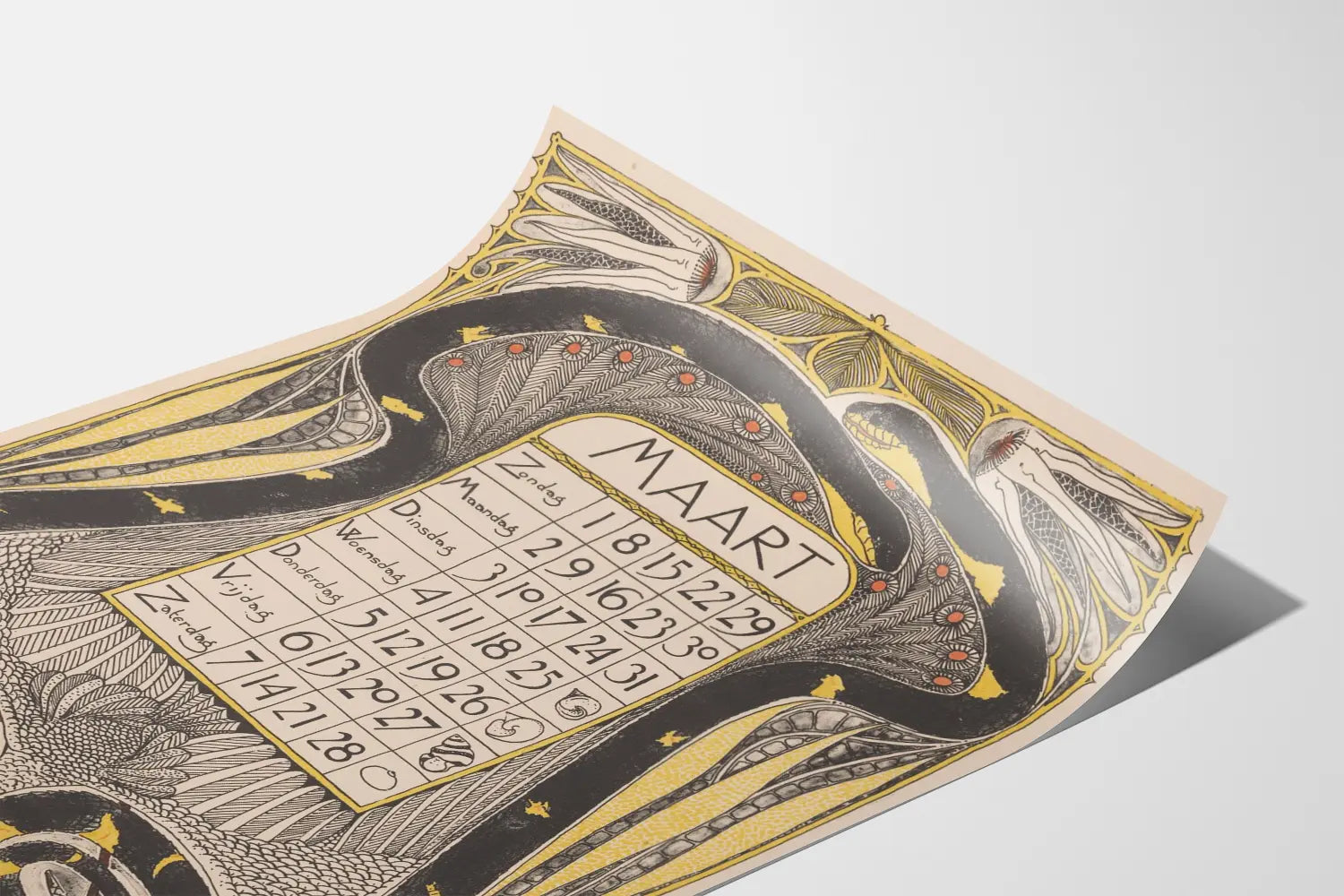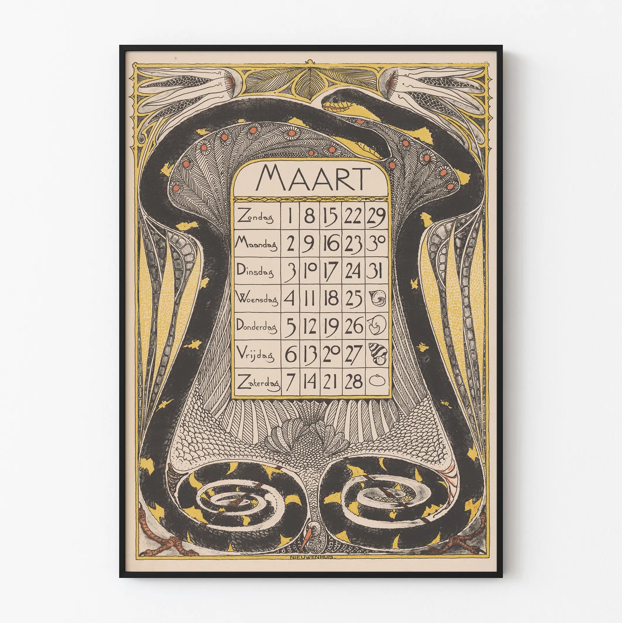 Ontdek deze originele kalenderposter die de maand maart 1896 afbeeldt, een uniek element voor uw muurdecoratie. Deze poster toont een gestileerde kalender, ingeschreven in een artistiek kader waar natuurlijke vormen en verfijnde motieven samenkomen. De dagen van de week en de datums worden weergegeven in het Nederlands met een delicate typografie die een vervlogen tijdperk oproept, en zo een vintage en historische sfeer aan uw interieur toevoegt. Het ontwerp presenteert een intrigerende compositie met gestileerde dierfiguren en plantaardige elementen, afgebeeld met fijne details in zwart, geel en rood, wat een sterk Art Nouveau-esthetiek uitstraalt. Dit wanddecorstuk nodigt uit tot een elegante retro sfeer, ideaal voor ruimtes die op zoek zijn naar een decoratief aspect dat zowel cultureel als grafisch is. Of het nu gaat om een woonkamer, kantoor of bibliotheek, deze poster verrijkt uw ruimte met de charme van vroeger en een unieke grafische uitstraling. Gemakkelijk in te lijsten, deze kalenderposter kan ook een uitstekend cadeau zijn voor liefhebbers van historische referenties gerelateerd aan kunst en grafisch ontwerp. Ze nodigt uit tot contemplatie en een reis terug in de tijd, waarbij functionaliteit en decoratieve schoonheid samenkomen. Een verstandige keuze voor wie een oud-stijl kunstwerk wil integreren in hun muurdecoratie, terwijl ze genieten van een echt verzamelkalender.
