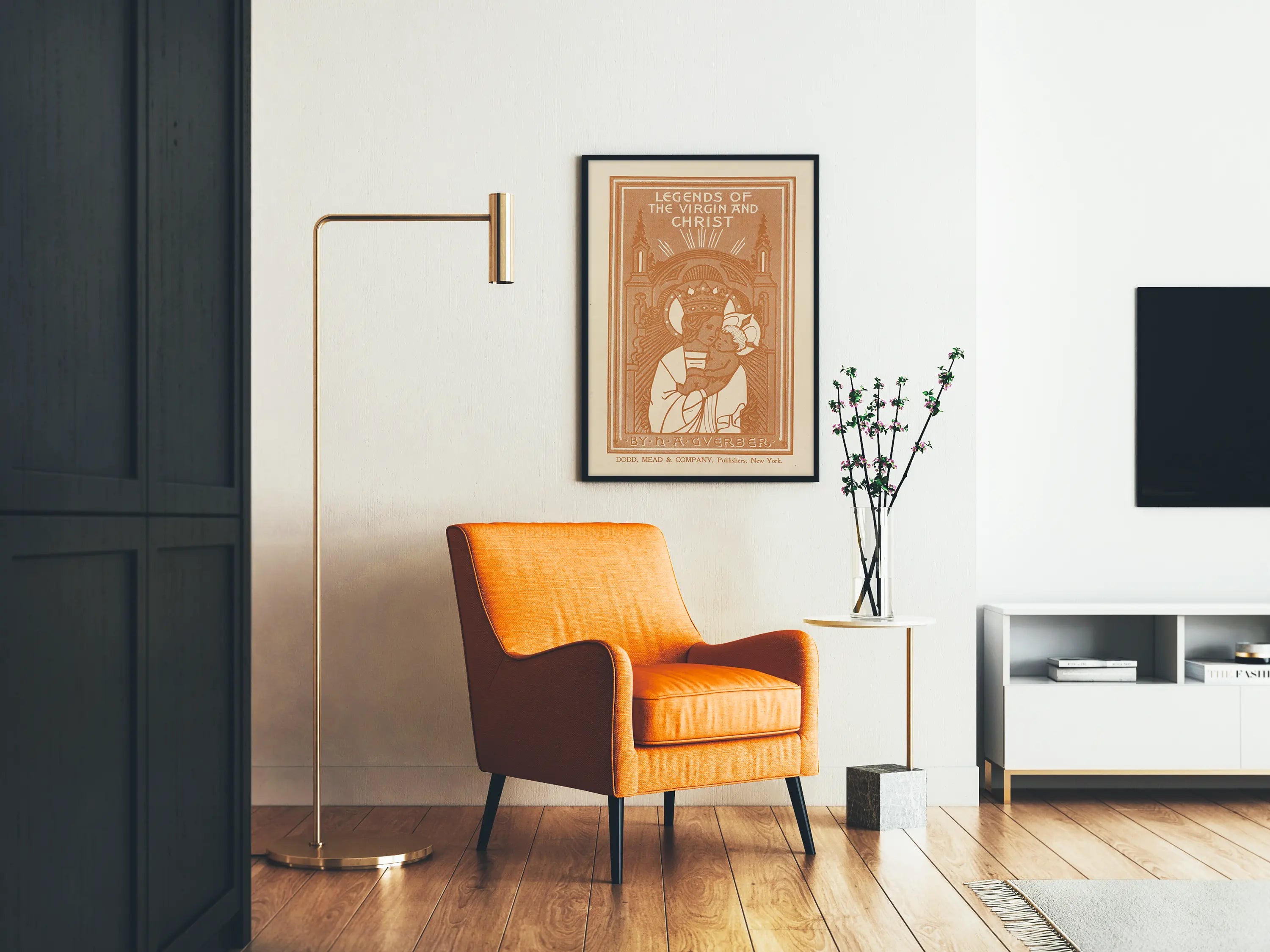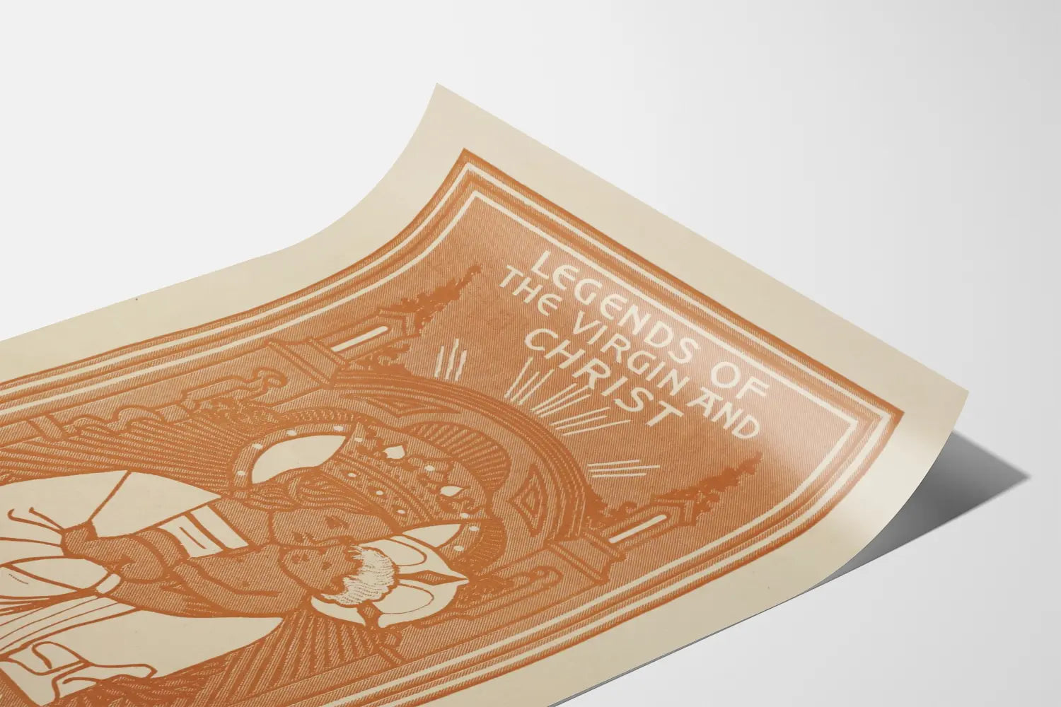 Deze vintage poster getiteld « Legenden van de Maagd en Christus » is een opvallend stuk wanddecoratie, ideaal voor liefhebbers van religieuze en klassieke kunst. Het afbeeldt een gestileerde scène van de Maagd Maria die het Kind Jezus vasthoudt; deze monochrome illustratie in okerkleuren brengt een vleugje elegantie en authenticiteit in elke ruimte. Het ontwerp is omgeven door fijne architecturale motieven, die een stijl suggereren geïnspireerd door middeleeuwse en gotische heilige kunst, met een compositie gericht op de twee heilige figuren, wat de sacrale en beschermende aard van dit werk versterkt. Deze poster vormt een perfecte decoratieve keuze voor ruimtes gewijd aan spiritualiteit, zoals salons, bibliotheken of slaapkamers, en brengt warmte en symbolische diepgang in de kamer. Als wanddecoratie kan ze worden gecombineerd met andere religieuze schilderijen of oude posters om een rijke en harmonieuze thematische muur te creëren. De sobere kleuren en de fijne lijntekening geven deze wandversiering een tijdloze charme, geschikt voor zowel klassieke als moderne interieurs. Deze hoogwaardige poster biedt de mogelijkheid om een ruimte te personaliseren en op subtiele wijze spirituele thema’s op te roepen. Ze richt zich zowel tot liefhebbers van religieuze kunst als tot verzamelaars van oude wanddecoraties, die karakter en geschiedenis aan hun omgeving willen toevoegen. Deze vintage poster is daarmee een onmisbaar stuk voor wie een krachtig symbool in zijn interieur wil integreren, met een verfijnde grafische stijl en een rustgevend visueel effect.