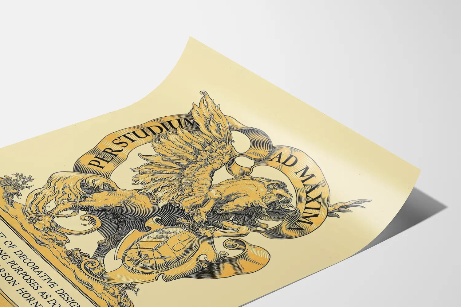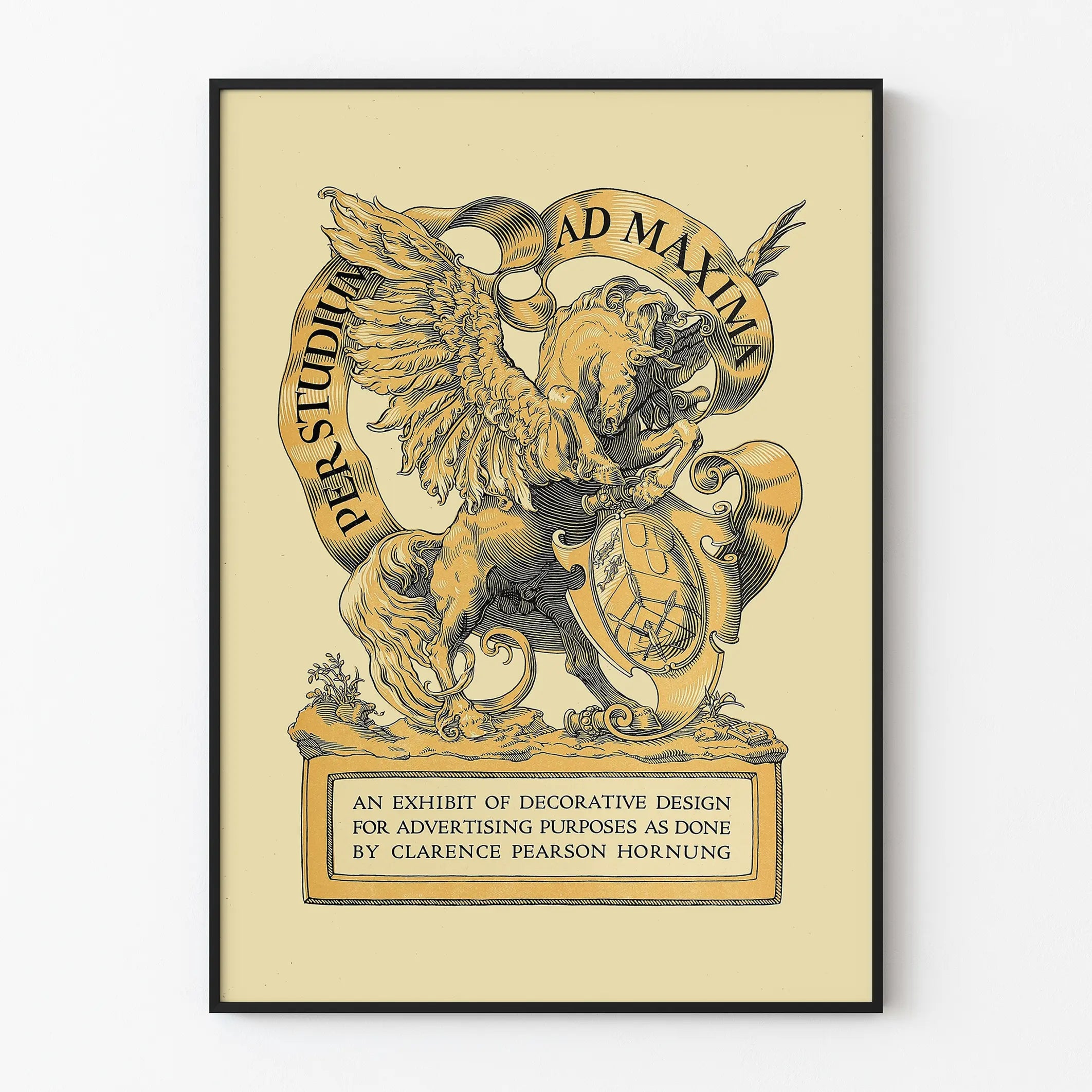 Deze decoratieve poster, getiteld "Per Studium Ad Maxima", toont een fijn getekende afbeelding van een rechtopstaand gevleugeld paard, vergezeld van een wapenschild dat in een elegante lint is gezet met de Latijnse spreuk. De grafische stijl in zwart en goud op een beige achtergrond geeft deze poster een klassieke en verfijnde uitstraling, perfect voor een muurdecoratie binnenshuis. Het werk benadrukt een ornamentaal ontwerp geïnspireerd op vintage, dat doet denken aan traditionele reclamekunst, met bijzondere aandacht voor de minutieuze details van de vleugels van het paard en de fijn gegraveerde texturen van het lichaam.