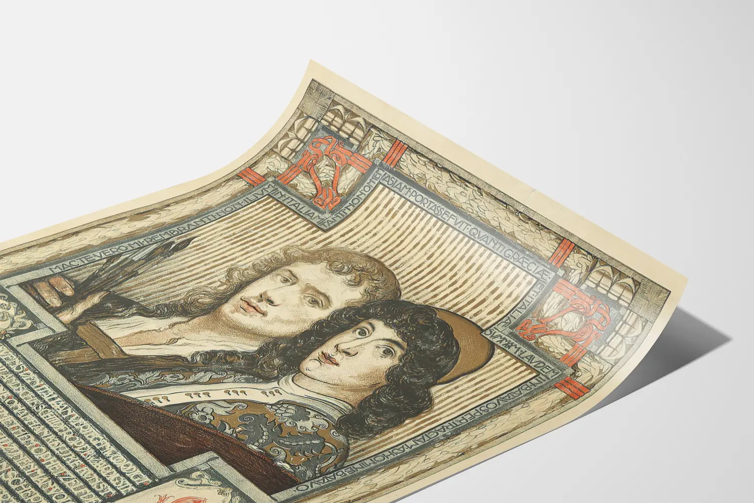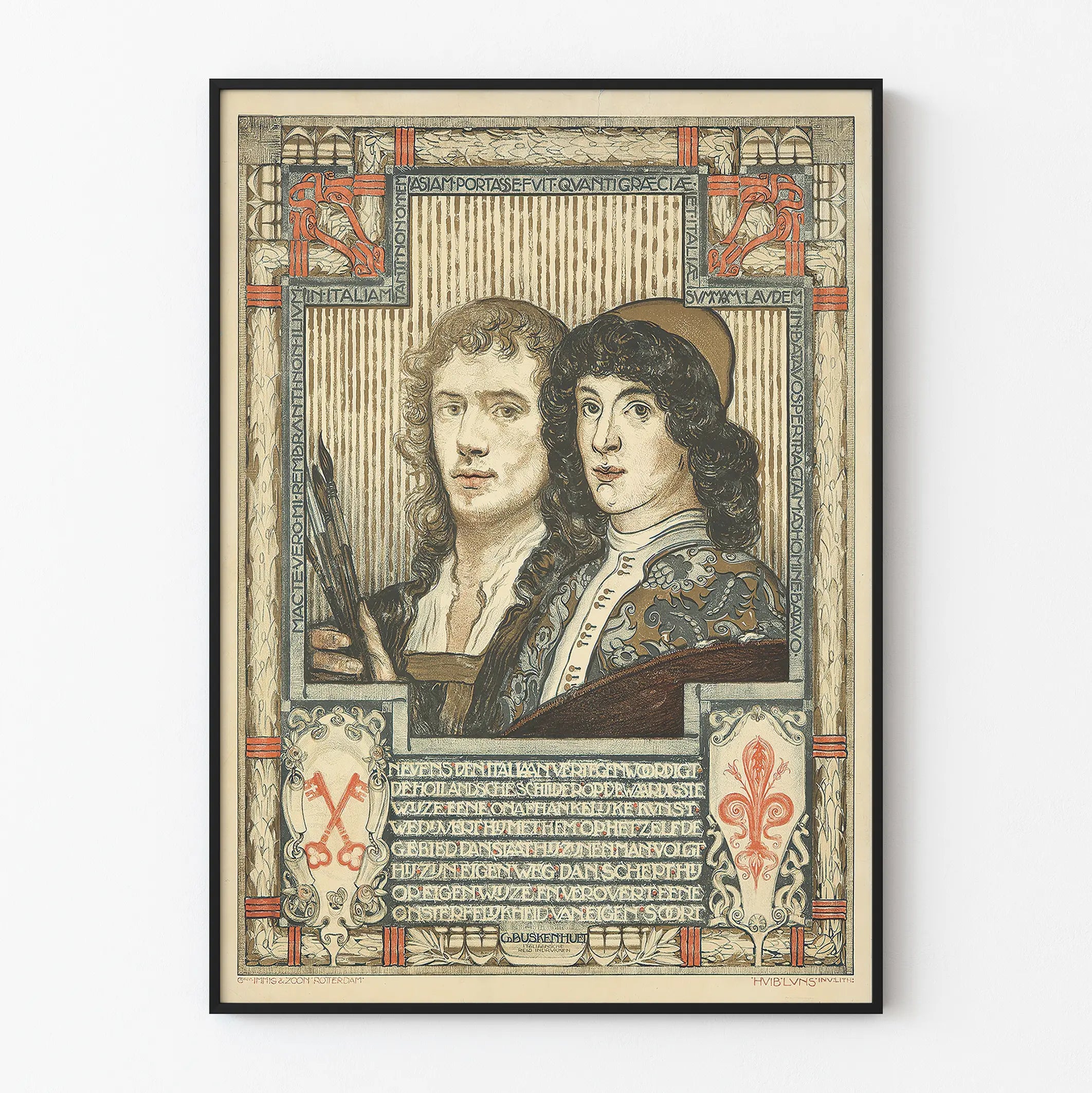 Deze affiche toont een iconisch duo van artistieke figuren op een ornamentale achtergrond, geïllustreerd door G. Buskenhuet. Het werk benadrukt twee portretten, waarschijnlijk geïnspireerd door de beroemde kunstenaars Rembrandt en Raphael, omgeven door een decoratief motief vol details. De grafische stijl herinnert aan lithografie en fijne tekeningen, met warme, genuanceerde kleuren die worden gedomineerd door beige, bruin en rood tinten. Deze elegante kunstdruk is gericht op alle liefhebbers van kunstgeschiedenis en verfijnde wanddecoratie. Ze kan dienen als poster om uw interieur of kantoor te verfraaien, en brengt een vleugje authenticiteit en cultuur. De ornamentale rand met oude inscripties en emblemen voegen een klassieke en waardevolle dimensie toe aan deze affiche, perfect voor liefhebbers van wanddecoratie gericht op kunst en traditie. Of het nu is om een bibliotheek, een kunstenaarsatelier of een ruimte voor inspiratie te verfraaien, deze kunstdruk belichaamt de tijdloze charme van de meesters van de schilderkunst. Het gedetailleerde formaat en de natuurlijke kleuren maken het gemakkelijk om in diverse decoratieve sferen te integreren, van vintage tot modern. Kies voor deze affiche als het middelpunt van uw wanddecoratie om een wereld te creëren gewijd aan de schoonheid van beeldende kunsten en de herinnering aan grote schilders.
