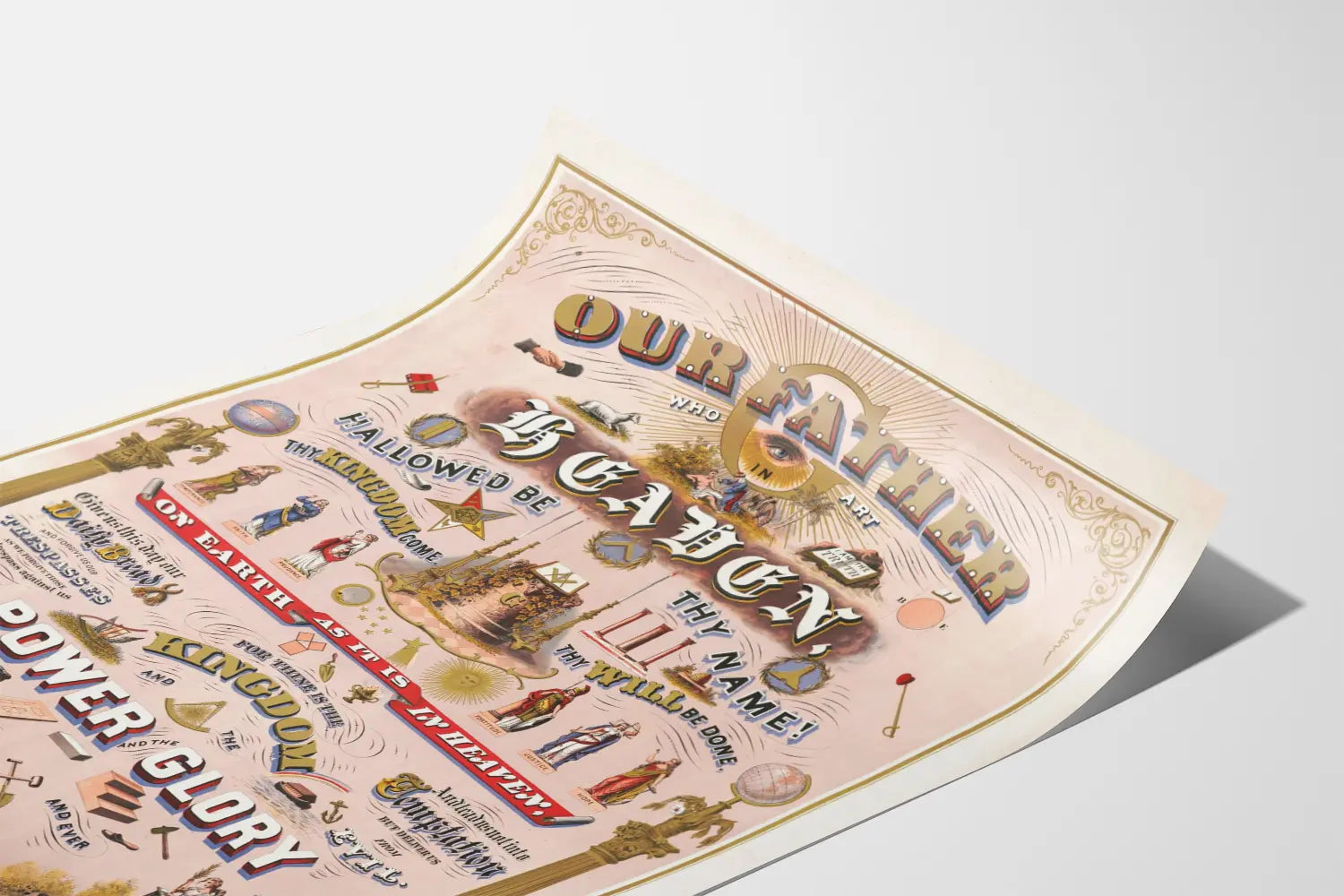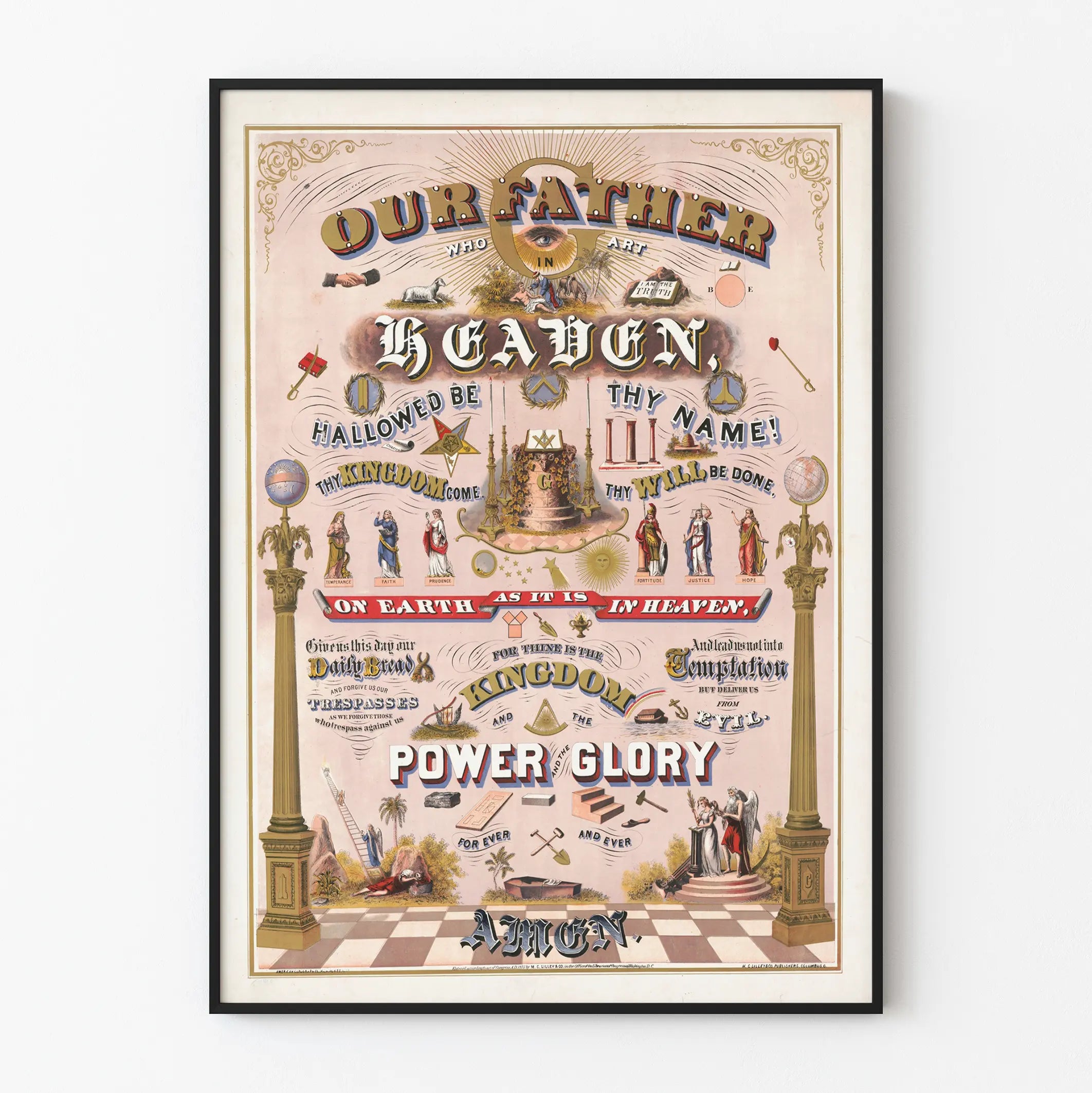 Deze poster Onze Vader is een wanddecoratie vol symboliek, die zich richt tot degenen die geloof en esthetiek willen combineren in hun interieur. Deze affiche illustreert de tekst van het gebed "Onze Vader", met een verzorgde compositie en een oud grafisch ontwerp dat een vintage stijl oproept, met versierde letters en traditionele iconografische elementen. In het midden wordt het woord "HEAVEN" (hemel) benadrukt, omringd door zinnen uit het gebed, zoals "Hallowed be Thy Name" (Heilig zij Uw naam) en "Thy Kingdom come" (Uw Koninkrijk kome), wat een gevoel van spirituele diepgang geeft. Verschillende religieuze en allegorische symbolen verrijken deze wanddecoratie: Dorische zuilen omlijsten de affiche, terwijl allegorische figuren die de deugden zoals matigheid, geloof, voorzichtigheid, kracht, rechtvaardigheid en hoop voorstellen, bijdragen aan een sfeer van evenwicht en inspiratie. Symbolische gereedschappen en mystieke elementen, zoals open boeken, samengebonden handen, een stralend oog en sterren, dragen eveneens bij aan de visuele rijkdom van het geheel. Deze decoratieve print, gedrukt in zachte kleuren op een pastelachtergrond, past gemakkelijk in een woonkamer, meditatiekamer of spirituele ruimte. Het brengt een vleugje authenticiteit en reflectie door zijn combinatie van typografische kunst en illustratie. Voor liefhebbers van religieuze of historische wanddecoratie is deze "Onze Vader" poster een keuze die traditie en vintage design combineert, terwijl het een universele boodschap van vrede en geloof uitstraalt. Dit affiche in posterformaat is geschikt voor eenvoudige of meer verfijnde lijstwerk, passend bij de decoratiestijl van elk interieur. Het is een ideaal stuk om een ruimte te personaliseren met een esthetische en betekenisvolle wanddecoratie.