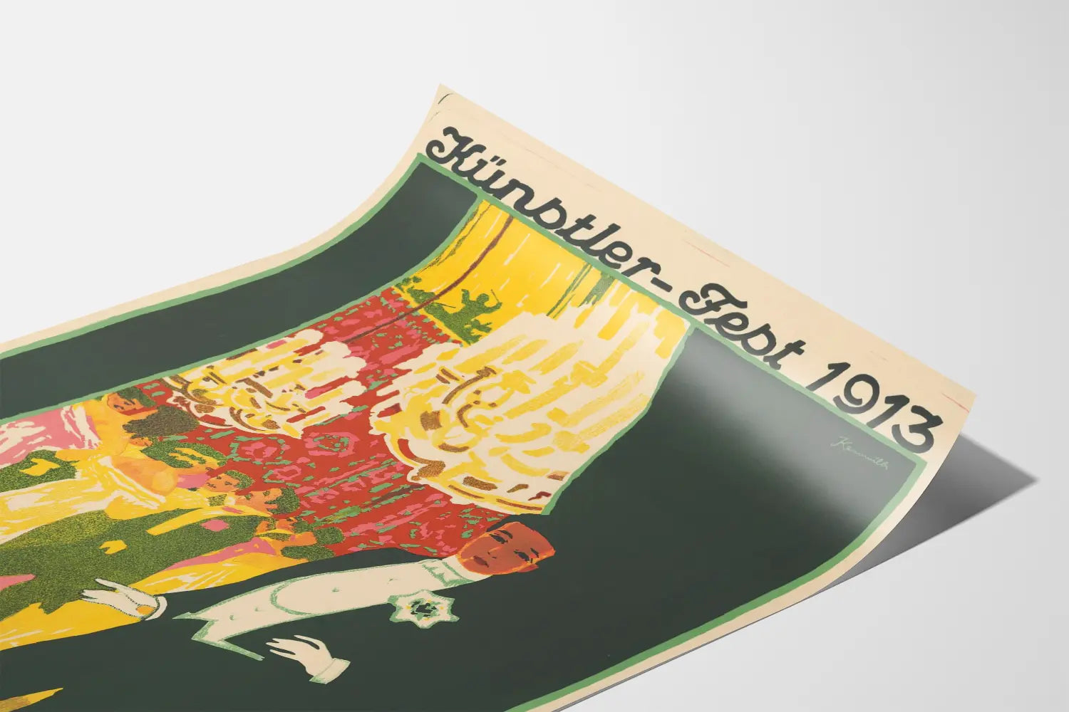 Deze oude affiche uit 1913, getiteld « Künstler-Fest 1913 », is een opvallend stuk vintage wanddecoratie, ideaal voor liefhebbers van kunst en geschiedenis. Ze beeldt een elegante scène uit van een prestigieus bal in de Stadskasino, met een feestelijke sfeer en personages gekleed in historische kostuums. Het unieke grafische ontwerp toont warme tinten van geel, rood en groen, gecombineerd met de silhouet van een man in een formeel wit en zwart pak, wat een vleugje elegantie en mysterie aan dit wandkunstwerk toevoegt.