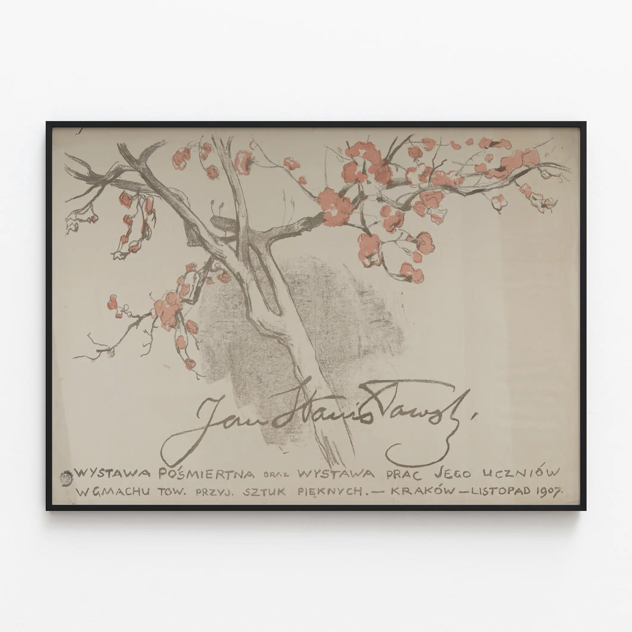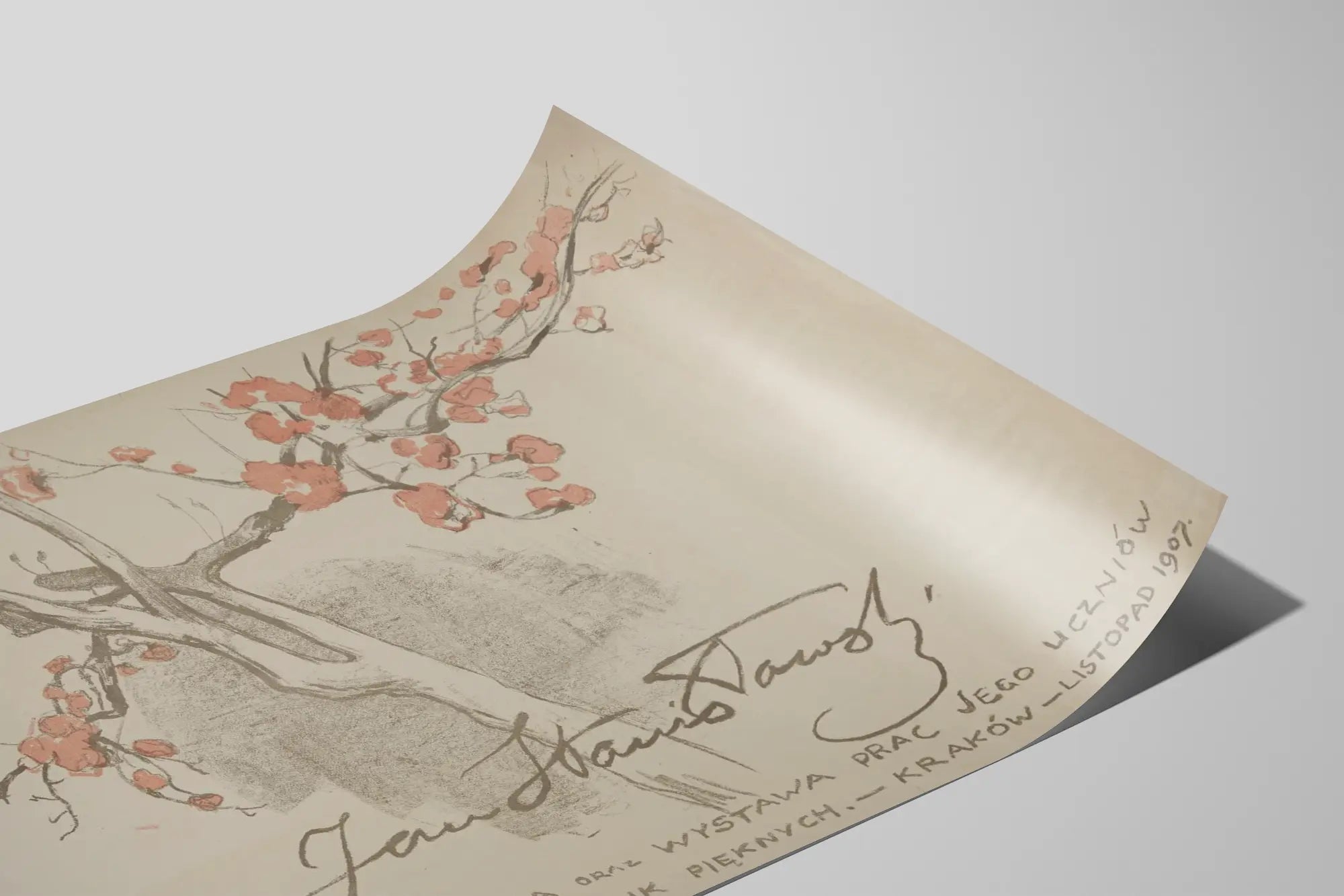 Ontdek deze uitzonderlijke artistieke affiche uit 1907, die een postume tentoonstelling gewijd aan Jan Stanislawski illustreert, evenals een presentatie van het werk van zijn leerlingen. Deze muurdecoratie onderscheidt zich door haar strakke en delicate stijl, met een centraal ontwerp dat takken van bloemen weergeeft in subtiele tinten roze en grijs. Deze vintage poster vormt een unieke keuze om een elegante inrichting te verfraaien, en brengt een vleugje geschiedenis en verfijning, typerend voor de artistieke tentoonstellingen uit het begin van de twintigste eeuw. Institutioneel verwijst de affiche naar een tentoonstelling georganiseerd in Krakau in het kader van de beeldende kunsten, en eert de pedagogische en creatieve invloed van deze meester. Als decoratief stuk combineert het klassieke esthetiek met authenticiteit, en biedt het een verfijnde sfeer voor uw woon- of kantoorruimte. De originaliteit van deze poster ligt in de handgeschreven kalligrafie, die een tijdloze charme geeft, ideaal voor liefhebbers van artistieke muurdecoratie en verzamelaars. Dit gedrukt schilderij bezit ook een opmerkelijke historische dimensie, perfect om een muur te verfraaien met een uitgesproken culturele en artistieke toets. Voeg deze poster toe aan uw collectie om uw interieurdecoratie te verheffen met een werk dat het erfgoed van een meester en de overdracht van zijn kunst aan zijn leerlingen viert.