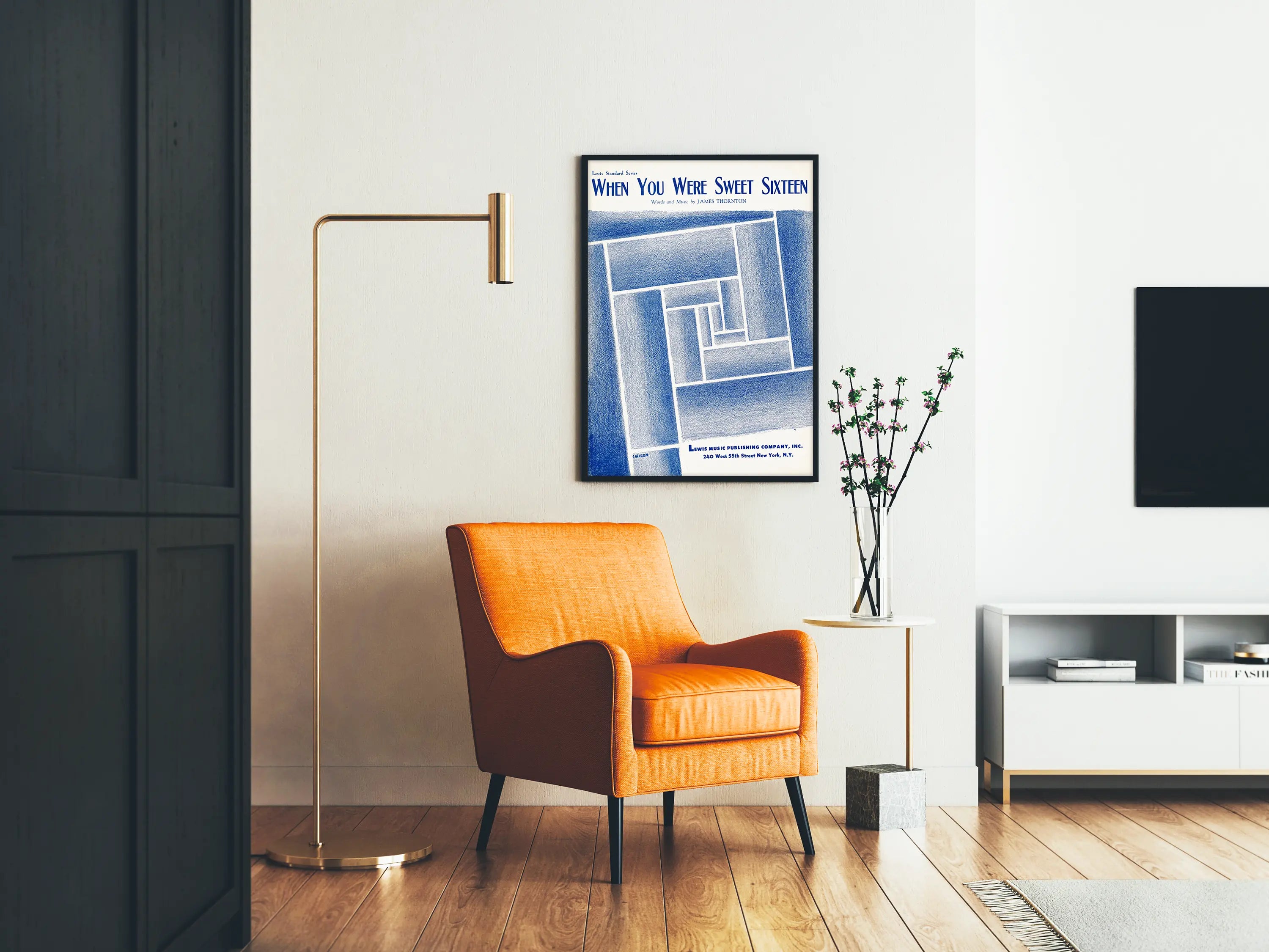 Gemaakt op een lichte achtergrond, benadrukt deze affiche een strakke en getextureerde grafische stijl die de aandacht trekt zonder overweldigend te zijn. De donkerblauwe tekst "When You Were Sweet Sixteen" bovenaan de affiche, evenals de vermelding "Words and Music by James Thornton", onderstrepen de muzikale oorsprong en brengen tegelijkertijd een poëtische dimensie in de inrichting van een ruimte. Het beeld bevat ook de handtekening "Chelson" in de linkerbenedenhoek, wat het artistieke en zorgvuldige werk van de maker bevestigt.