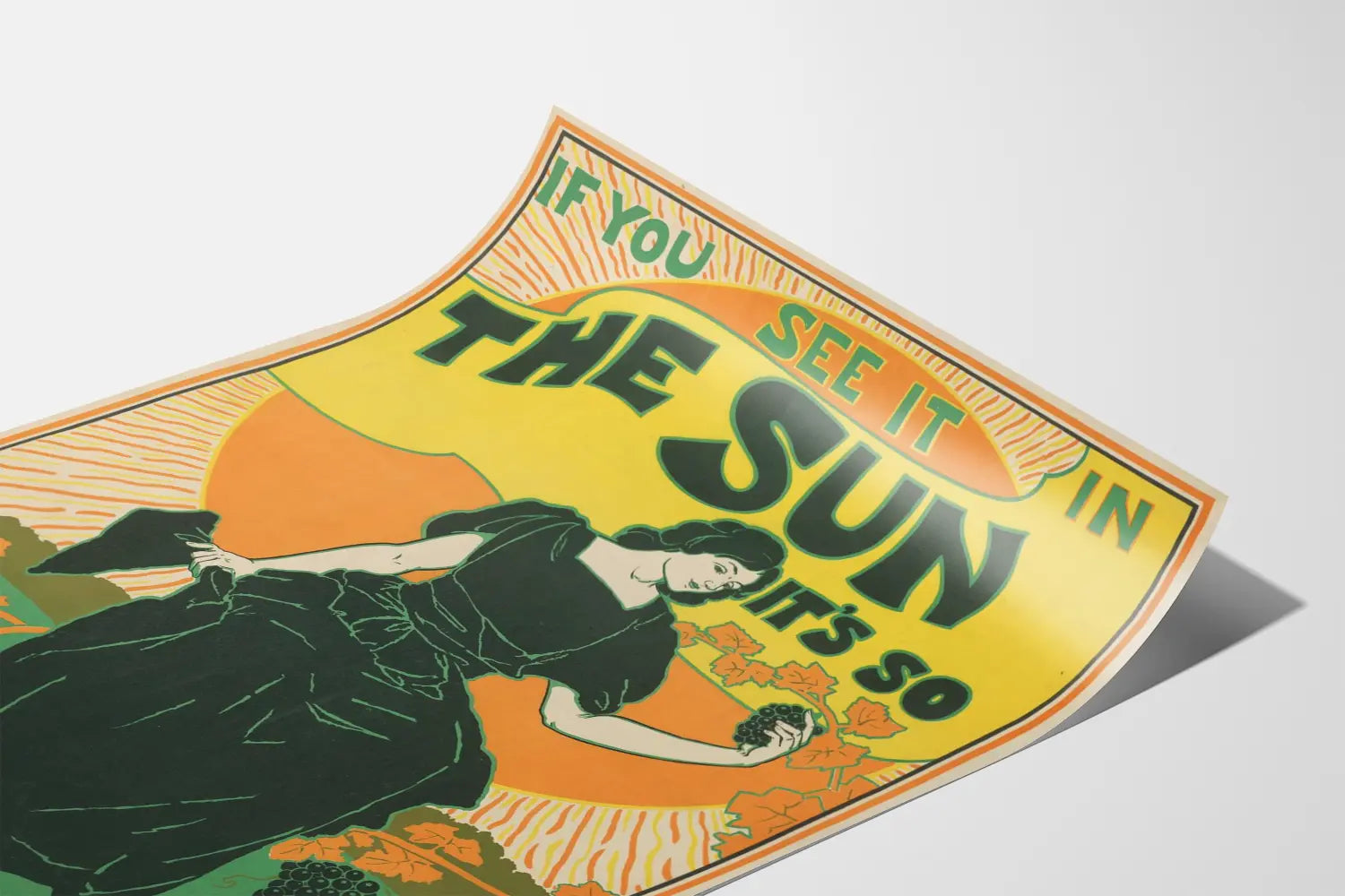 Deze boeiende vintage poster brengt een vleugje elegantie en originaliteit in uw muurdecoratie. Voorstellend een vrouw in een klassieke zwarte jurk, die een tros druiven vasthoudt, benadrukt deze poster een gedurfde en kleurrijke typografische speelsheid met de zin "If You See It In The Sun It's So Read It". De achtergrond in verloop van geel en oranje roept warmte en zonlicht op, terwijl de bladeren en druiventrossen een natuurlijke en warme sfeer toevoegen.