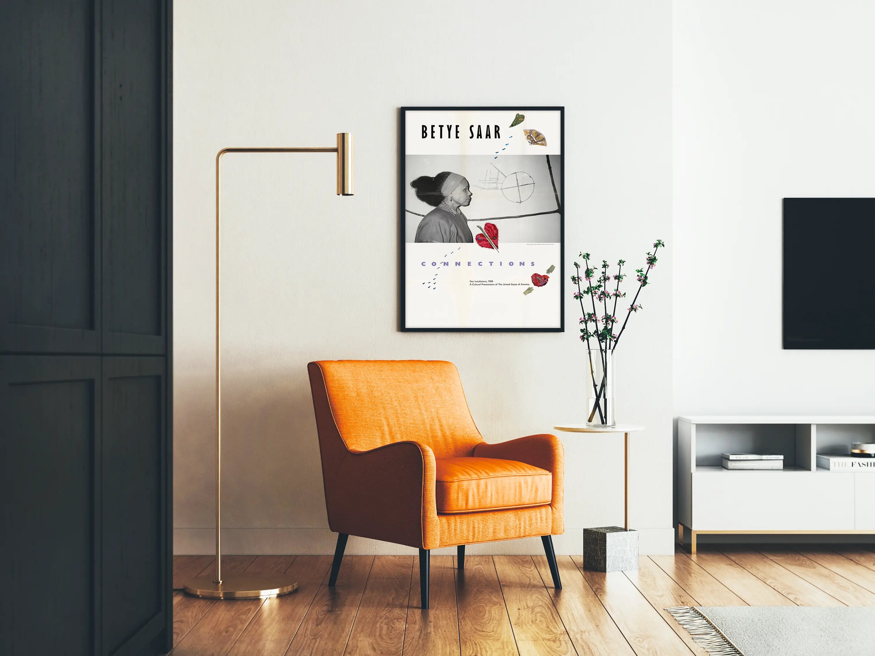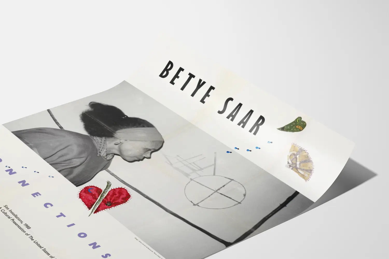 Ontdek deze vintage poster getiteld « Connections » van Betye Saar, een uniek kunstwerk dat in 1988 werd gepresenteerd als muursculptuur. Deze poster combineert een zwart-witfoto van een vrouw van profiel met kleurrijke en symbolische grafische elementen, zoals rode doornenharten, kleine blauwe details, groene handen en organische abstracte vormen. Deze decoratieve elementen brengen een levendig en dynamisch contrast in de monochrome compositie, waardoor de artistieke boodschap wordt versterkt. Deze affiche vertegenwoordigt een tijdperk en stijl die fotografie en collage samenvoegen om een muurdecoratie te bieden vol betekenis en culturele herinneringen, perfect voor kunstliefhebbers en interieurdecorateurs. De poster is onderaan rechts gesigneerd, wat de visuele en artistieke authenticiteit garandeert. Door deze muurschildering te kiezen, brengt u zowel een krachtig visueel kunstwerk als een subtiele culturele geschiedenis in uw interieur. Deze poster past zowel in een moderne woonkamer als in een creatieve ruimte, en verfraait uw muren met zijn retro-esthetiek en grafische details. Een echt verzamelstuk voor degenen die muurposters waarderen die fotografie en hedendaagse kunst combineren.