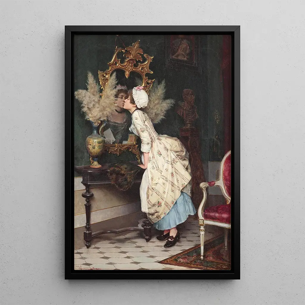 De kunstdruk van "Een kus in de reflectie" is een decoratief stuk dat uw interieur zal verrijken, of het nu in een woonkamer, kantoor of slaapkamer is. De kwaliteit van de afdruk en de trouwheid van de kleuren eren het originele werk, terwijl het een vleugje elegantie en romantiek toevoegt aan uw decoratie. Dit schilderij, met zijn onmiskenbare esthetische aantrekkingskracht, wordt een echt middelpunt dat bewondering en contemplatie oproept bij uw gasten. Gun uzelf deze doek om uw ruimte te transformeren in een plek vol emoties en tijdloze schoonheid.