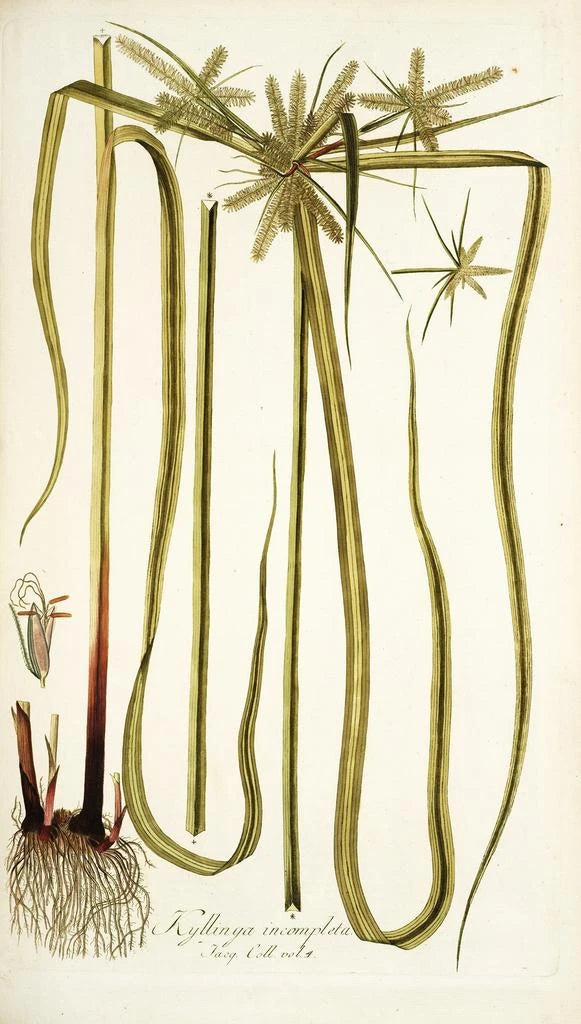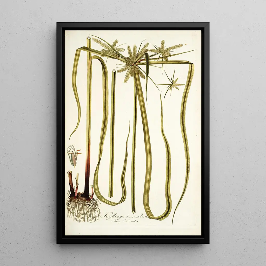 Kylinga incompleta, iconisch werk van Nikolaus Joseph Freiherr von Jacquin, vangt de essentie van exotische flora met ongeëvenaarde verfijning. De levendige kleuren van deze kunstdruk roepen de rijkdom van tropische landschappen op, waar elk detail minutieus is weergegeven. De aquareltechniek, gebruikt door Jacquin, geeft het doek een lichtheid en vloeiendheid, waardoor organische vormen kunnen bloeien op het papier. De sfeer die uit dit werk straalt, is zowel sereen als fascinerend, en nodigt de kijker uit om onder te dompelen in een weelderige plantenwereld.