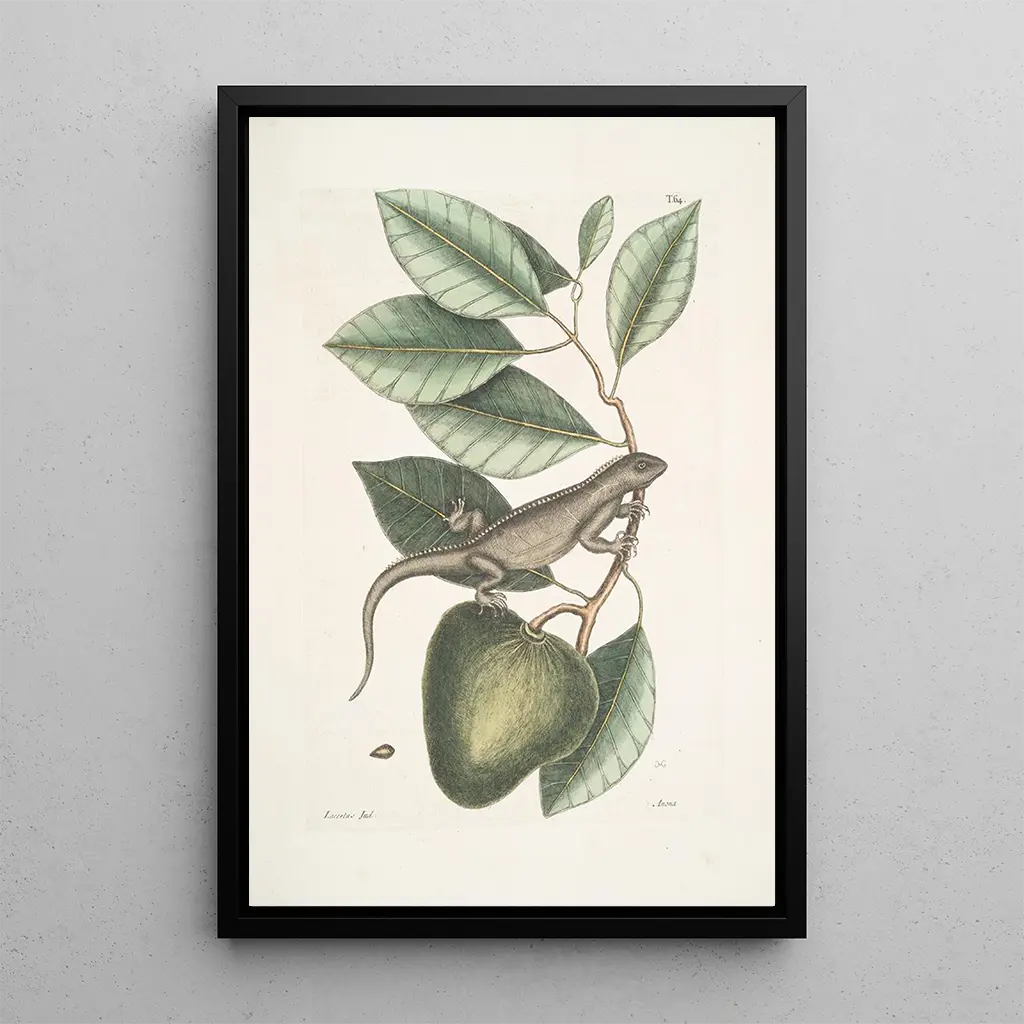 De kunstdruk "Lacertus Indicus L'iguane Anona" van Mark Catesby is een schilderij dat de schoonheid en majesteit van de fauna oproept. In deze voorstelling staat de iguana trots rechtop, zijn schubben glinsteren onder het licht, terwijl de weelderige achtergrond van tropische vegetatie een levendige sfeer creëert. De rijke kleuren en de minutieuze details getuigen van Catesby's meesterschap in observatie en weergave. De aquareltechniek, gecombineerd met gouache-accenten, maakt het mogelijk om de textuur van de huid van de iguana en de delicadezza van de omringende bladeren vast te leggen, en nodigt de kijker uit tot een meeslepende contemplatie.