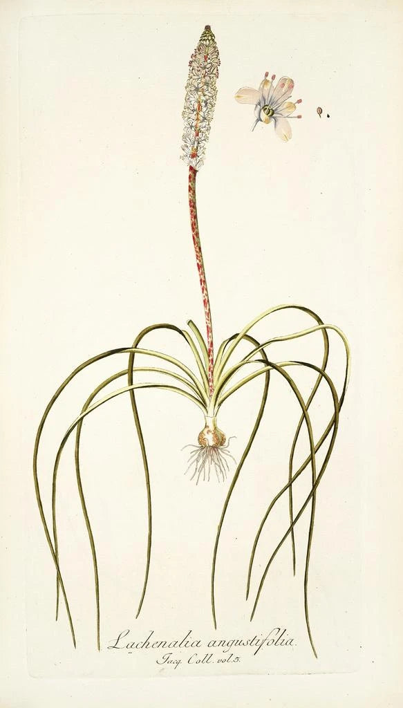 Nikolaus Joseph Freiherr von Jacquin, botanist en kunstenaar uit de achttiende eeuw, markeerde zijn tijd met zijn bijdragen aan de botanica en de kunst. Zijn reizen over de hele wereld stelden hem in staat om vele plantensoorten te ontdekken en te documenteren, waaronder Lachenalia angustifolia. Zijn artistieke stijl, gekenmerkt door wetenschappelijke precisie en esthetische gevoeligheid, weerspiegelt de geest van de Verlichting, waarin nieuwsgierigheid en exploratie centraal stonden. Jacquin heeft zo een erfenis achtergelaten die schoonheid en kennis combineert, en die toekomstige generaties van kunstenaars en wetenschappers beïnvloedt.