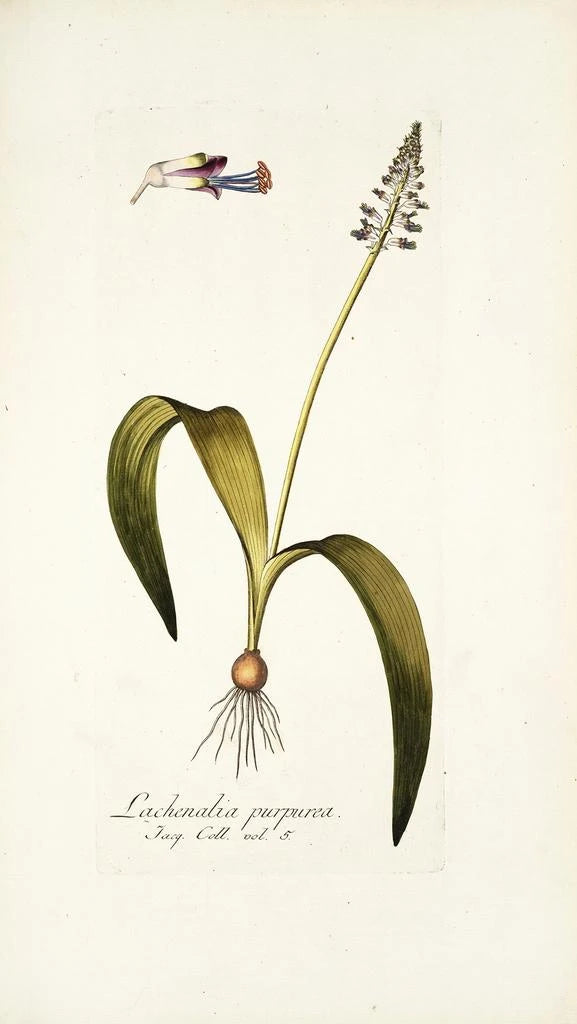 Nikolaus Joseph Freiherr von Jacquin, actief in de achttiende eeuw, is een iconische figuur in de botaniek en kunst. Geboren in 1727 in Oostenrijk, werd hij beïnvloed door de wetenschappelijke stromingen van zijn tijd, met name de classificatiestroming van planten. Zijn werken, vaak gemaakt tijdens zijn reizen, getuigen van zijn inzet om exotische flora te documenteren. Als lid van de Academie der Wetenschappen heeft Jacquin bijgedragen aan de vooruitgang van botanische kennis, terwijl hij een artistiek gevoel in zijn representaties bracht. Lachenalia purpurea past binnen deze traditie, die wetenschap en esthetiek combineert.