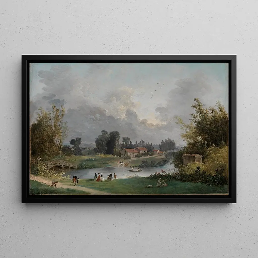 Deze kunstdruk, getiteld "Landschapspark", nodigt uit tot een onderdompeling in een wereld van sereniteit en natuurlijke schoonheid. Hubert Robert, meester van het landschap, gebruikt een palet van zachte en heldere kleuren, waarbij de heldere groenen van de bomen zich mengen met de delicate nuances van de lucht. De techniek van olieverf stelt je in staat om de details met opmerkelijke fijnheid weer te geven, waardoor een rustige en contemplatieve sfeer ontstaat. De natuurlijke elementen, zoals kronkelende rivieren en schaduwrijke paden, lijken de kijker uit te nodigen om erdoor te wandelen, de frisheid van de lucht en de zachtheid van het licht te voelen.