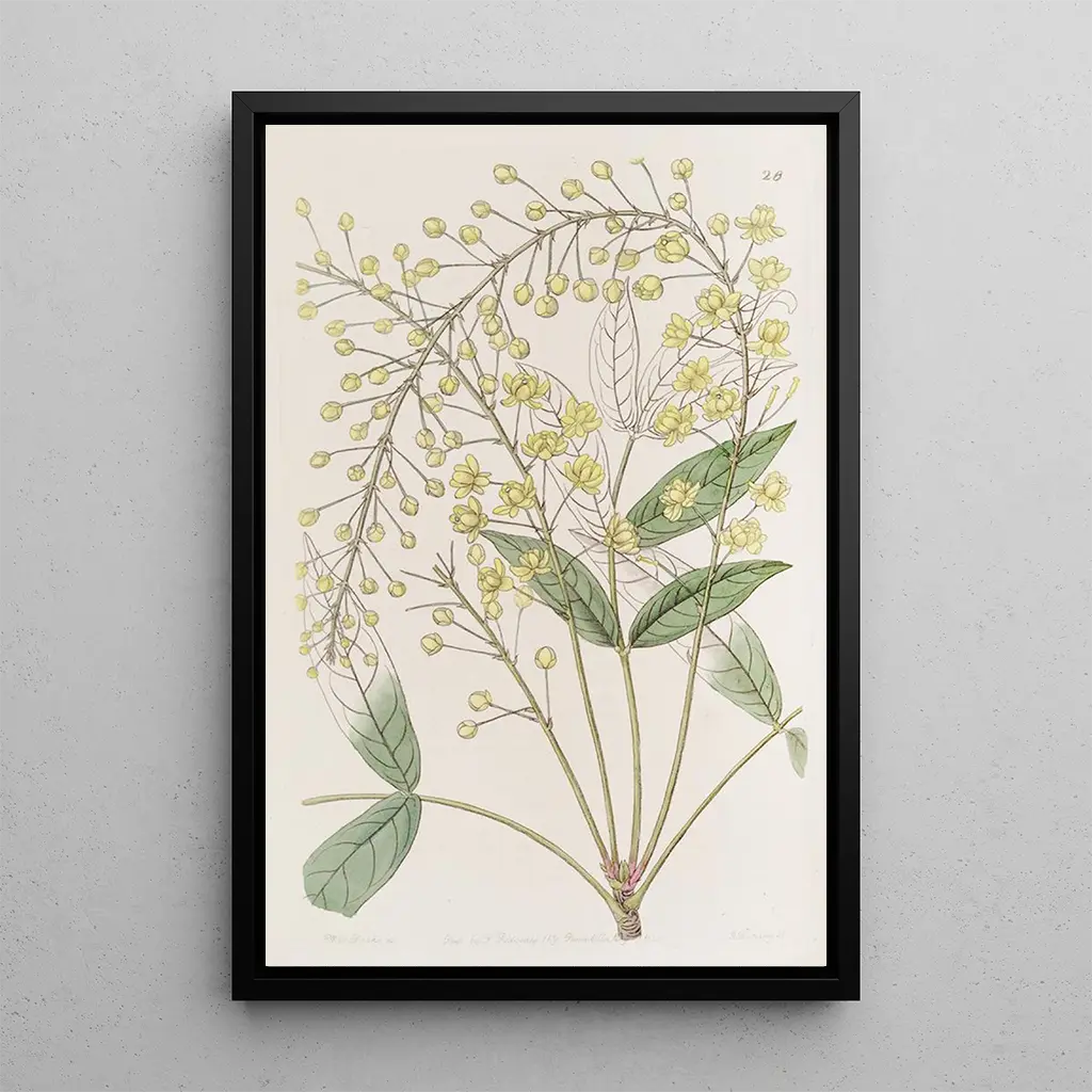 L'épine-vinette à feuilles de frêne fines, avec ses teintes vibrantes et ses formes délicates, évoque une nature à la fois sauvage et maîtrisée. Cette œuvre de Sydenham Edwards, célèbre pour ses illustrations botaniques, capture l'essence même de cette plante. Les couleurs riches, allant du vert profond aux nuances dorées, se mêlent harmonieusement pour créer une atmosphère vivante. La technique d'aquarelle utilisée par l'artiste permet de rendre chaque détail avec une précision étonnante, donnant vie à cette épine-vinette, comme si elle était prête à s'épanouir sous nos yeux.