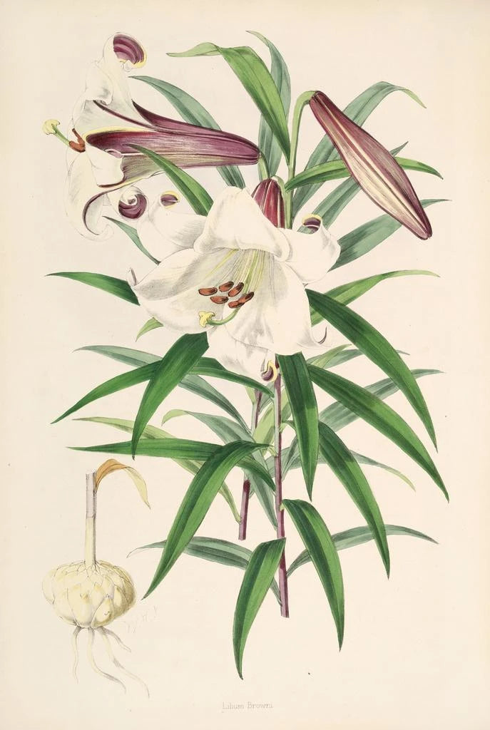 De kunstdruk van Lilium Browni, geïllustreerd door Walter Hood Fitch, brengt ons naar een weelderige tuin waar de schoonheid van de bloemen met glans wordt uitgedrukt. Dit werk wordt gekenmerkt door zijn levendige kleuren en minutieuze details, die de fijnheid van de bloemblaadjes en de rijkdom van de nuances benadrukken. De aquareltechniek, beheerst door Fitch, geeft deze doek een helderheid en lichtheid die de blik boeien. De sfeer van dit kunstwerk is zowel vrolijk als sereen, uitnodigend tot een ontsnapping naar verre oorden.