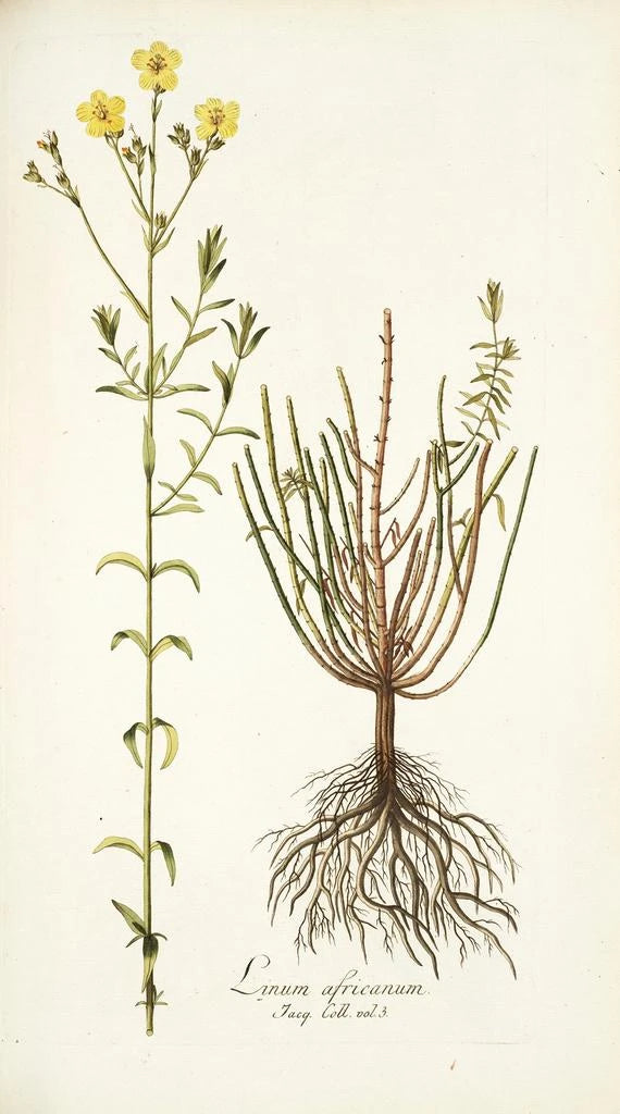 Nikolaus Joseph Freiherr von Jacquin, botanist en illustrator uit de achttiende eeuw, heeft de geschiedenis van de botanische kunst verrijkt met zijn betekenisvolle bijdragen. Zijn reizen over de hele wereld, vooral in Afrika, stelden hem in staat om een verscheidenheid aan planten te ontdekken en te documenteren. Zijn aanpak combineert wetenschap en kunst, waardoor zijn werken niet alleen informatief zijn maar ook esthetisch aantrekkelijk. Linum africanum is een perfect voorbeeld van zijn talent, dat de rijkdom van de biodiversiteit en het belang van het behoud van plantensoorten illustreert. Zijn werk blijft een referentie voor liefhebbers van botanica en kunst.