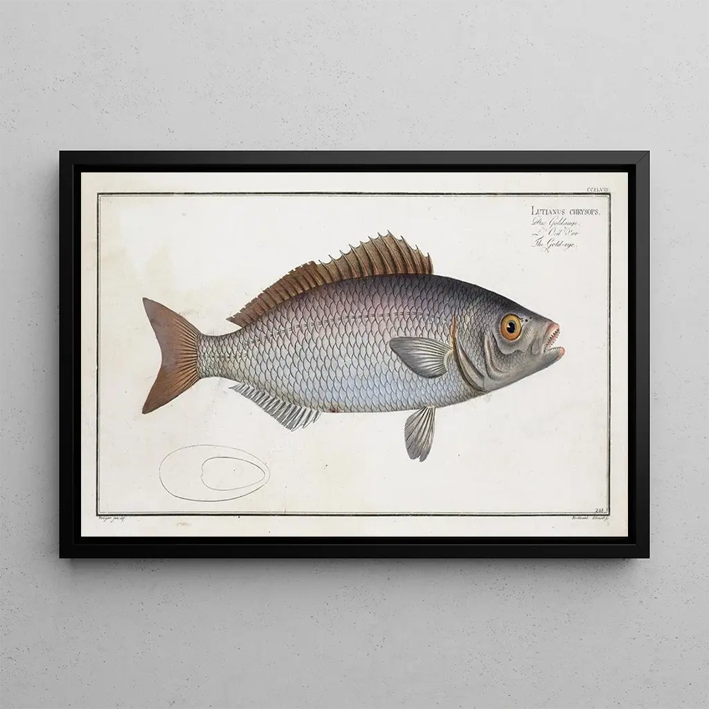 Lutjanus chrysops Le Goldeye : een ode aan de maritieme schoonheid De kunstdruk Lutjanus chrysops Le Goldeye, een iconisch werk van Marcus Elieser Bloch, dompelt ons onder in een fascinerende waterwereld. Dit schilderij, rijk aan details, benadrukt de pracht van deze vis met levendige kleuren. De tinten blauw en zilver, gecombineerd met accenten van geel, creëren een heldere en levendige sfeer. De aquareltechniek, beheerst door de kunstenaar, maakt het mogelijk om de vloeiendheid van het water en de delicatesse van de schubben vast te leggen, en biedt een ware uitnodiging tot verwondering over de natuur. Marcus Elieser Bloch : een pionier in artistieke ichthyologie Marcus Elieser Bloch, natuurkundige en kunstenaar uit de achttiende eeuw, wordt erkend voor zijn bijdragen aan de ichthyologie, de wetenschap van vissen. Zijn werk, vaak gekenmerkt door oog voor detail en een wetenschappelijke aanpak, past binnen de stroming van het naturalisme. Geïnspireerd door de maritieme ontdekkingen van zijn tijd, wist Bloch kunst en wetenschap te combineren en eer te betonen aan de aquatische biodiversiteit. Zijn illustraties, waaronder de kunstdruk Lutjanus chrysops Le Goldeye, zijn niet alleen kunstwerken, maar ook waardevolle documenten voor het begrip van mariene soorten. Een decoratief stuk met vele voordelen De kunstdruk van het schilderij Lutjanus chrysops Le Goldeye is een ideale decoratieve keuze om uw interieur te verfraaien. Of het nu in een woonkamer, kantoor of slaapkamer is, dit doek brengt een vleugje elegantie en frisheid. De kwaliteit van de afdruk garandeert een goede weergave van de kleuren en details van het originele werk, terwijl het een onmiskenbare esthetische aantrekkingskracht heeft. Door dit kunstwerk in uw inrichting te integreren, brengt u de schoonheid van de natuur in uw leefruimte en viert u tegelijkertijd de artistieke erfenis van Marcus Elieser Bloch.