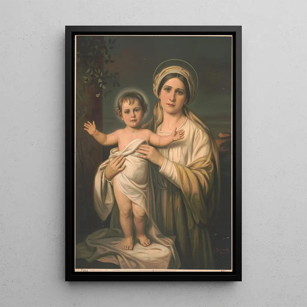 La kunstdruk de la Vierge Marie tenant l'Enfant Jésus de Franz Doubek évoque une atmosphère empreinte de douceur et de sérénité. Dans cette œuvre, la palette de couleurs chaudes, dominée par des tons dorés et des nuances de bleu, crée une ambiance apaisante. La technique de l’artiste, qui mêle réalisme et éléments stylistiques baroques, permet de capturer l’intimité entre la mère et son enfant. Les détails délicats des visages et des drapés témoignent d'un savoir-faire exceptionnel, invitant le spectateur à une contemplation profonde de cette scène sacrée.