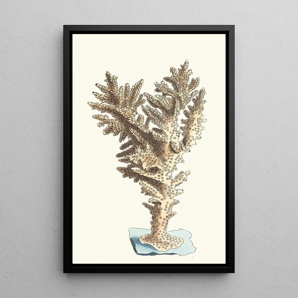 De kunstdruk Madrepore muricé van George Shaw nodigt uit tot het verkennen van de wonderen van de onderwaterwereld. Met tinten van diepblauw en accenten van levendig koraal, roept dit werk de rijkdom en diversiteit van het zeeleven op. Shaw, die een minutieuze schildertechniek gebruikt, slaagt erin de delicate textuur van de koralen en de vloeiendheid van de mariene vormen vast te leggen. De sfeer die van dit doek uitgaat, is zowel rustgevend als fascinerend, en transporteert ons naar een universum waar de natuur heerst.