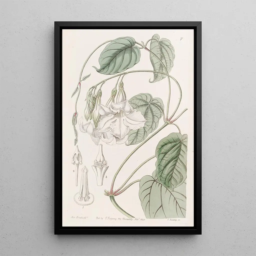 De kunstdruk van de Mandevilla douce dompelt ons onder in een wereld van zachtheid en lichtheid. Met haar tere roze bloemblaadjes, bijna pastelachtig, roept dit werk de vergankelijke schoonheid op van bloemen in volle bloei. De delicate nuances mengen harmonieus, waardoor een rustgevende en romantische sfeer ontstaat. De aquareltechniek, gebruikt door Sydenham Edwards, maakt het mogelijk de transparantie en de helderheid van de bloemen vast te leggen, waardoor deze compositie tot leven komt. Elk detail wordt zorgvuldig weergegeven, van de nerven van de bladeren tot de krommingen van de bloemblaadjes, en nodigt de kijker uit tot een aandachtige contemplatie.