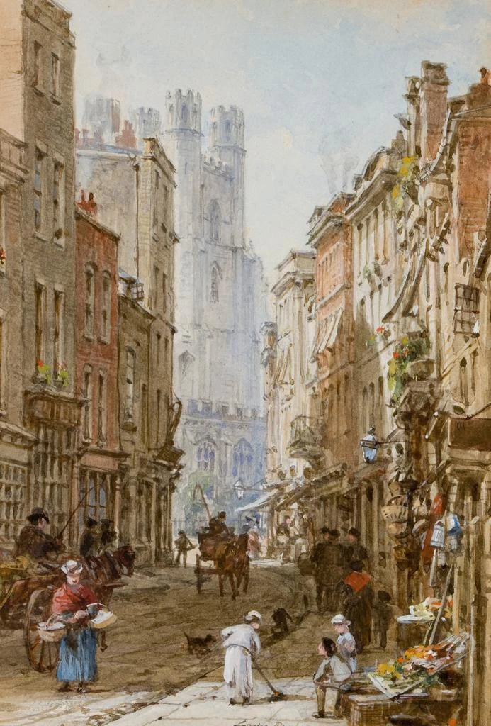 Louise Rayner, een belangrijke figuur in de Victoriaanse kunst, is beroemd om haar weergaven van het dagelijks leven in Engelse steden. Opgevoed in een artistieke omgeving, werd ze beïnvloed door de sociale en stedelijke veranderingen van haar tijd. Haar werken, vaak doordrenkt met nostalgie, vangen de schoonheid van straten en markten, en getuigen van een periode waarin het stadsleven in volle verandering was. Door te kiezen voor het weergeven van plaatsen zoals Market Street in Cambridge, wist Rayner vluchtige momenten uit de geschiedenis te vereeuwigen, en eer te betonen aan de architectuur en cultuur van haar tijd.