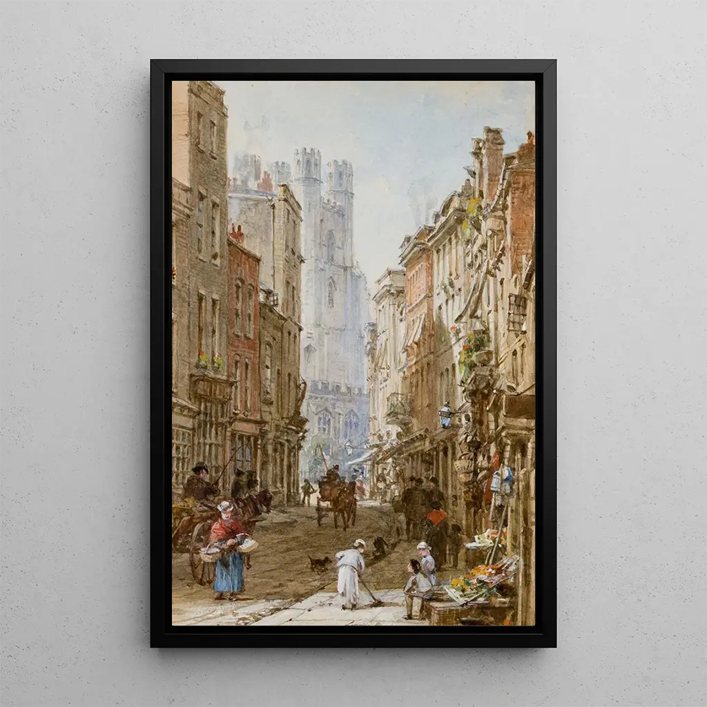 Market Street Cambridge, kunstdruk van Louise Rayner, illustre met verve de levendige sfeer van een markt in het hart van de stad. De minutieuze details van de kleurrijke kraampjes en voorbijgangers creëren een dynamische en warme atmosfeer. Rayner, dankzij haar beheersing van licht en schaduw, slaagt erin om deze scène tot leven te brengen, waarbij elk personage een verhaal lijkt te vertellen. De heldere tinten en de delicate nuances van de aquarel voegen een bijna tastbare dimensie toe aan de kunstdruk, waardoor de kijker wordt uitgenodigd om zich onder te dompelen in de levendigheid van deze iconische locatie.
