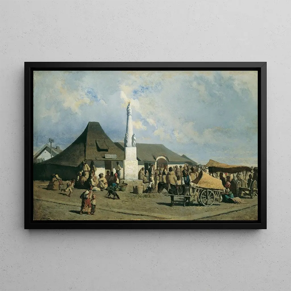 In deze kunstdruk van Place du Marché à Szolnok vangt de kunstenaar Johann Gualbert Raffalt de essentie van een levendig moment, waar de heldere kleuren en minutieuze details samenkomen om een warme sfeer te creëren. De tinten groen en blauw domineren het schilderij, wat de frisheid van een zonnige dag oproept, terwijl de rode en oranje accenten een levendige dynamiek toevoegen. De techniek van Raffalt, die impressionisme en realisme combineert, laat bijna de beweging van de personages en de animatie van de markt voelen. Elk element, van de fruitkramen tot de voorbijgangers, draagt bij aan een rijke en boeiende visuele vertelling.
