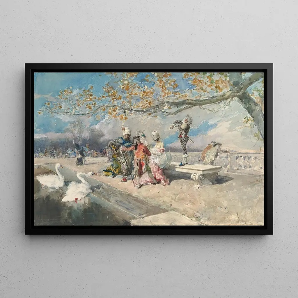 Mascarade : een levendig schilderij vol leven en mysterie In "Mascarade" vangt Mariano Fortuny Marsal de essentie van een kleurrijk feest, waar gemaskerde figuren tot leven komen onder een zachte en warme lichtstraal. De rijke tinten rood, goud en blauw mengen harmonieus, waardoor een sfeer ontstaat die zowel feestelijk als raadselachtig is. De techniek van de kunstenaar, die realisme en impressionisme combineert, brengt elk detail tot leven, van de flamboyante kostuums tot de uitdrukkingen op de gezichten. Dit schilderij nodigt de kijker uit om onder te dompelen in een wereld van vreugde en mysterie, waar elk masker een verhaal vertelt en elke beweging een emotie oproept. Mariano Fortuny Marsal : een meester van het Spaanse realisme Mariano Fortuny Marsal, geboren in 1838 in Granada, is een iconische figuur van het Spaanse realisme van de 19e eeuw. Geïnspireerd door de grote meesters van de schilderkunst, ontwikkelt hij een unieke stijl die een grote technische beheersing combineert met een poëtische gevoeligheid. Fortuny staat ook bekend om zijn reizen naar het Oosten, die zijn werk verrijken met exotische kleuren en motieven. Zijn carrière, gekenmerkt door indrukwekkende successen, maakt hem tot een pionier in de kunst van het weergeven van scènes uit het dagelijks leven en feestelijke evenementen, zoals blijkt uit "Mascarade". Een decoratief stuk met vele voordelen De kunstdruk van "Mascarade" is een ideale keuze om je interieur te verfraaien, of het nu in een woonkamer, kantoor of slaapkamer is. De hoge kwaliteit van de afdruk en de esthetische aantrekkingskracht maken het een doek dat de aandacht trekt en gesprekken uitlokt. Door dit schilderij in je decoratie te integreren, voeg je een vleugje elegantie en cultuur toe aan je ruimte, terwijl je profiteert van de levendige energie die deze feestelijke scène uitstraalt. Gun jezelf een kunstwerk dat de tijd overstijgt en je dagelijks leven verrijkt.