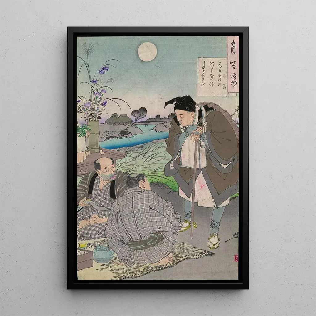 In deze kunstdruk eert Tsukioka Yoshitoshi Matsuo Bashō, de meester van de haiku, door de essentie van zijn poëtische gevoeligheid vast te leggen. De delicate nuances en geïnspireerde motieven uit de natuur roepen een serene en contemplatieve sfeer op. Yoshitoshi, met zijn onderscheidende stijl, slaagt erin de harmonie tussen mens en omgeving over te brengen, een thema dat Bashō dierbaar is. De verfijnde details van dit werk getuigen van een diepe bewondering voor de vergankelijke schoonheid van het leven, en nodigen de kijker uit tot reflectie over de eenvoud en diepgang van alledaagse momenten.